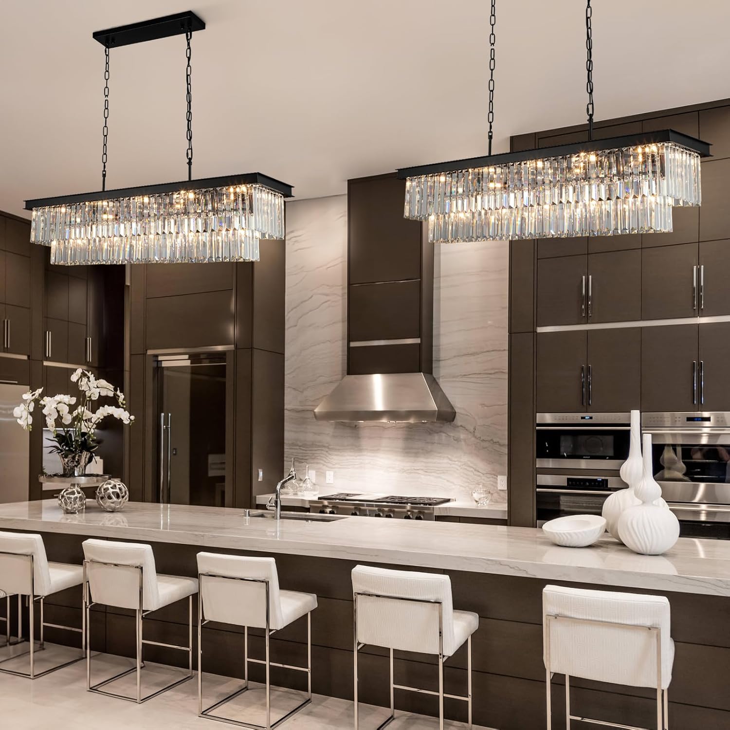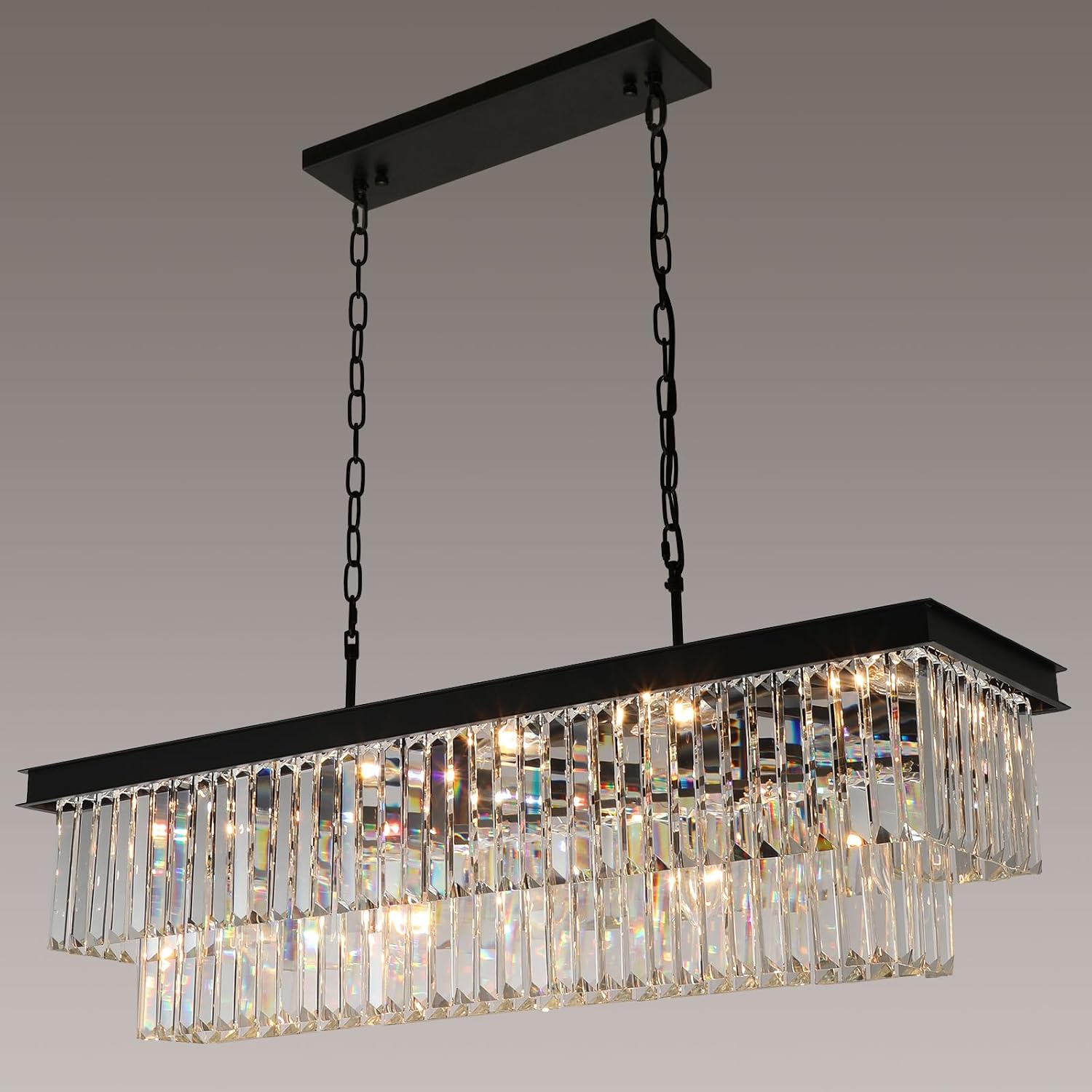 - BLACK CRYSTAL CHANDELIERS:This chandeliers for dining room using K9 crystal with 2-tier design and black rectangular lamp frame.When you turn on the light,the lighting will reflect through the crystal,adding a romantic and unique atmosphere to your room