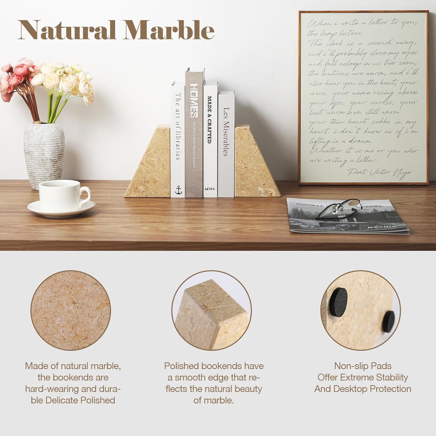 Marble Bookend for Heavy Books, Decorative Bookends for Shelves, Durable and Heavy-Duty Book End for Hardback Book & CDS, Unique Book Stopper & Holder, Pearlly Yellow, Set of 2