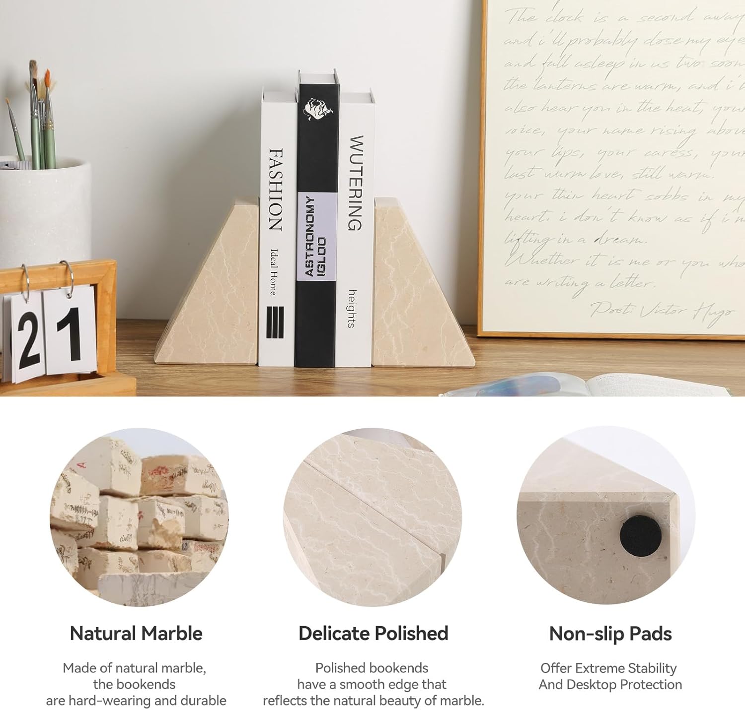 - MARBLE BOOKENDS: Delicate, flowing veins in soft beige and warm taupe tones create a dynamic yet harmonious visual appeal. This karibiber marble bookends for shelves will remain original form after a long time of use. The aesthetic marble book ends also maintains long-term stability.