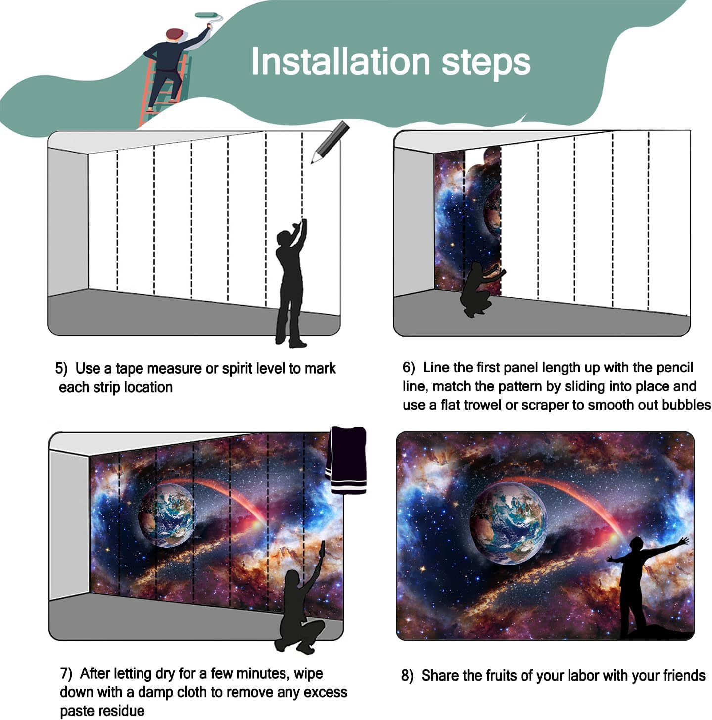- Mural wallpaper size: 140 "W x 91 "H, divided into 7 sections, each section is labeled with a number underneath, there is no need to overlap the pattern when installing, just install according to the number labeled underneath the panel