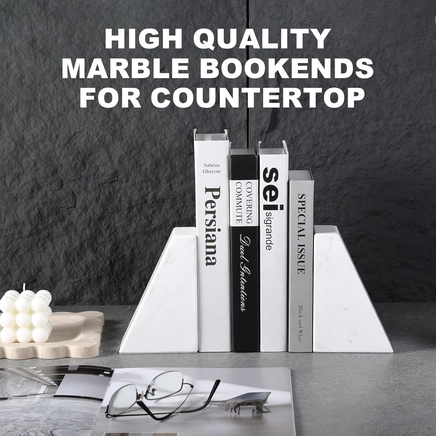 Marble Bookends for Heavy Books, Decorative Book Ends for Shelves, White Stone Durable and Heavy-Duty Book Ends for Hardback Books & CDS, Unique Book Stopper & Holder, Set of 2