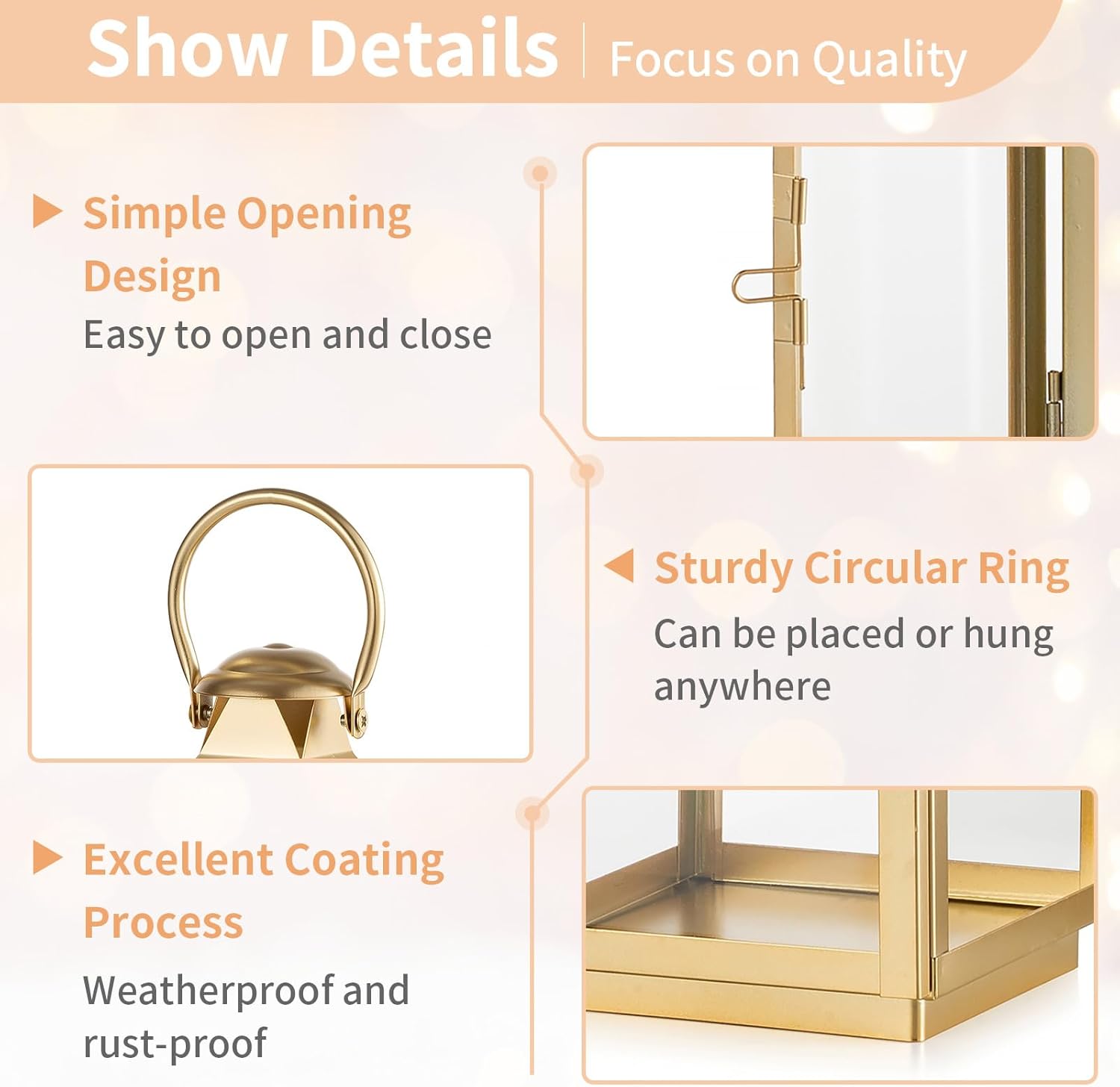 - 【Lantern with Matte Gold Coating】Check out this dazzling gold lantern, boasting a smooth and exquisite matte finish that emits a gentle, warm light. It's a breath of fresh air compared to the standard black lanterns, bringing a dash of sophistication and highlighting your distinctive taste.