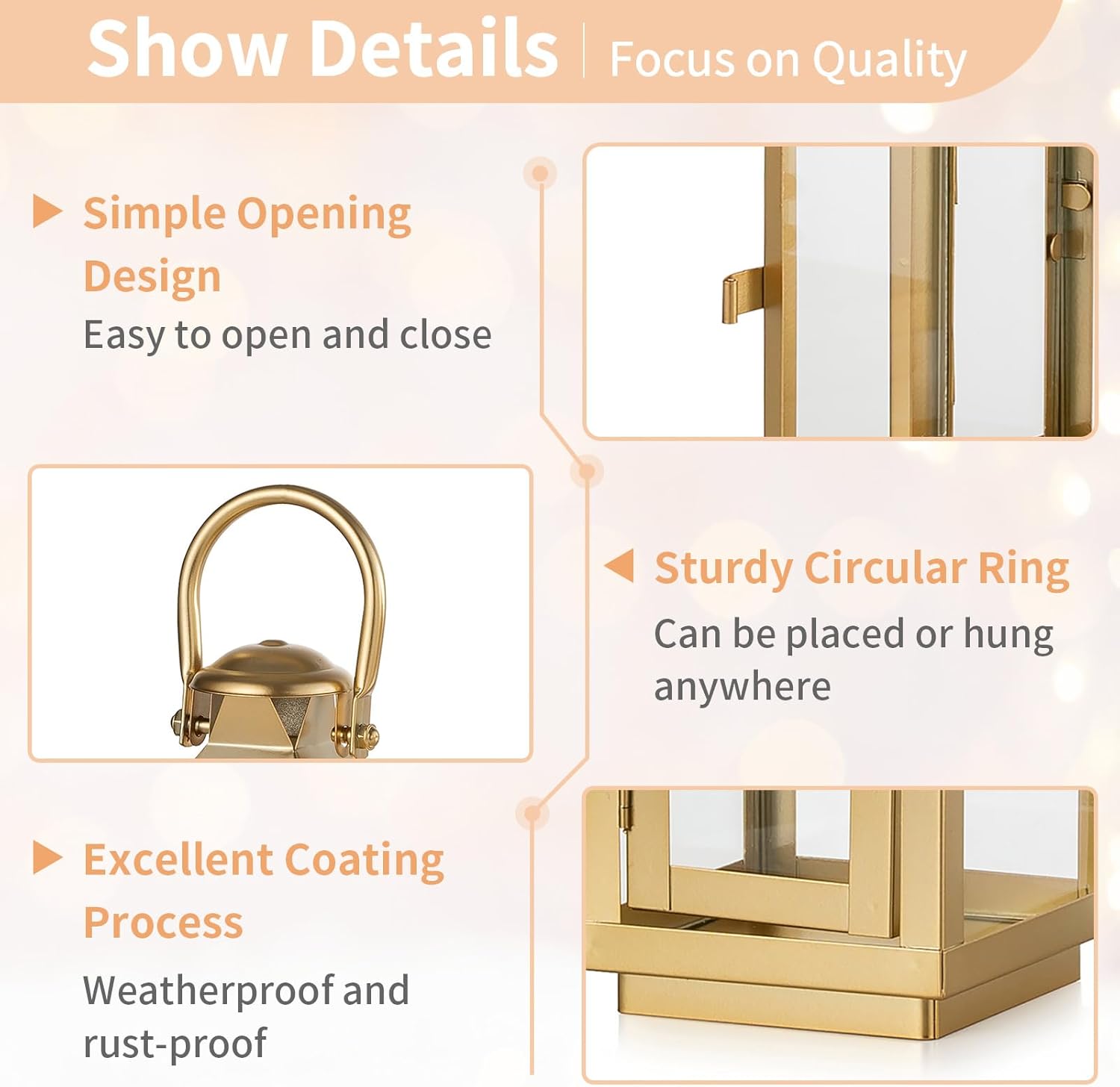 - 【Lantern with Matte Gold Coating】Check out this dazzling gold lantern, boasting a smooth and exquisite matte finish that emits a gentle, warm light. It's a breath of fresh air compared to the standard black lanterns, bringing a dash of sophistication and highlighting your distinctive taste.