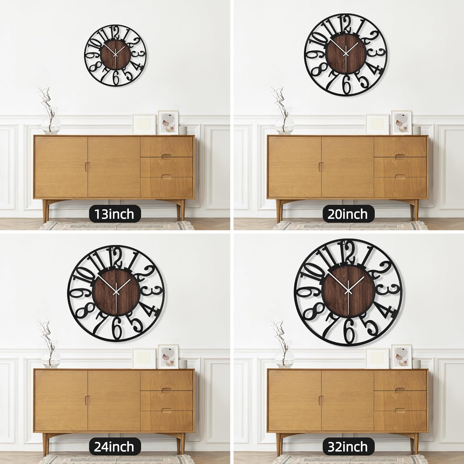 Maxstar Round Wall Clock for Living Room Decor Battery Operated Non Ticking Black Metal Wood Clocks for Home Living Room Garden Office Kitchen Decoration -16 inch