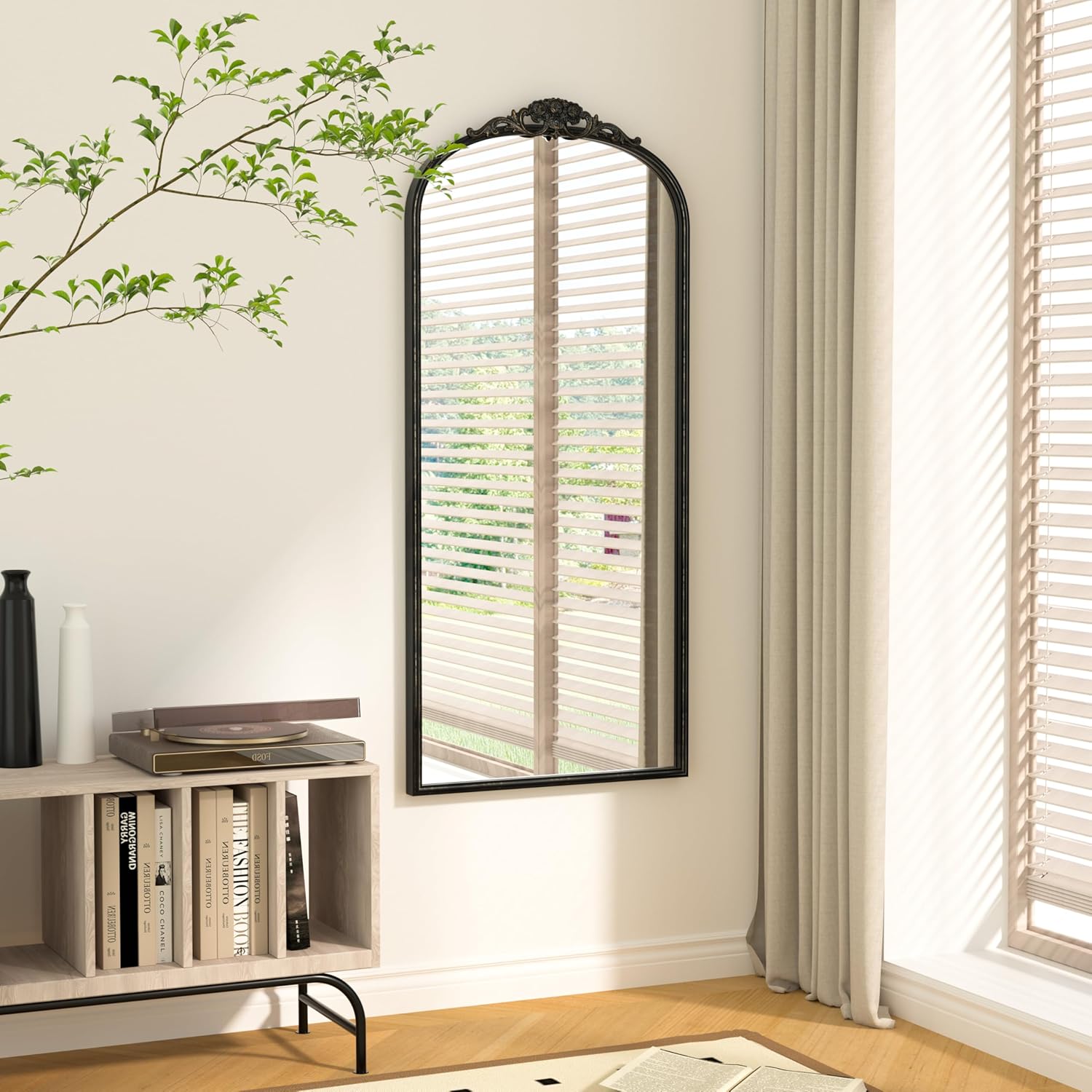 Keonjinn Arched Wall Mirror, 48" x 22" Vintage Mirror Full Length, Black Traditional Decoration Baroque Style, Ornate Mirrors for Hallway, Fireplace, French Cleat Mounting