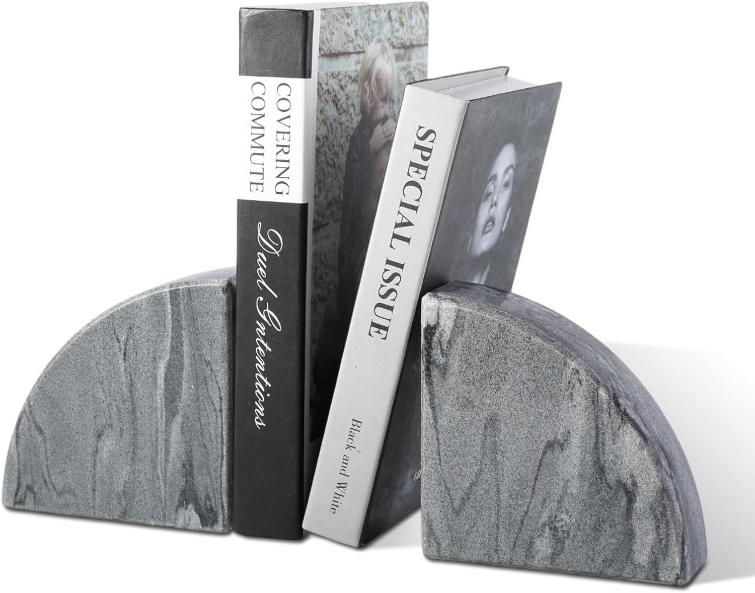 Marble Bookend for Shelves, Non-Skid Bookends for Heavy Books, Heavy Duty Book Stopper for CDs, Luxury Book Shelf Holder, Quarter Circle Design Book Ends Decorative, Monte Grigio, Set of 2