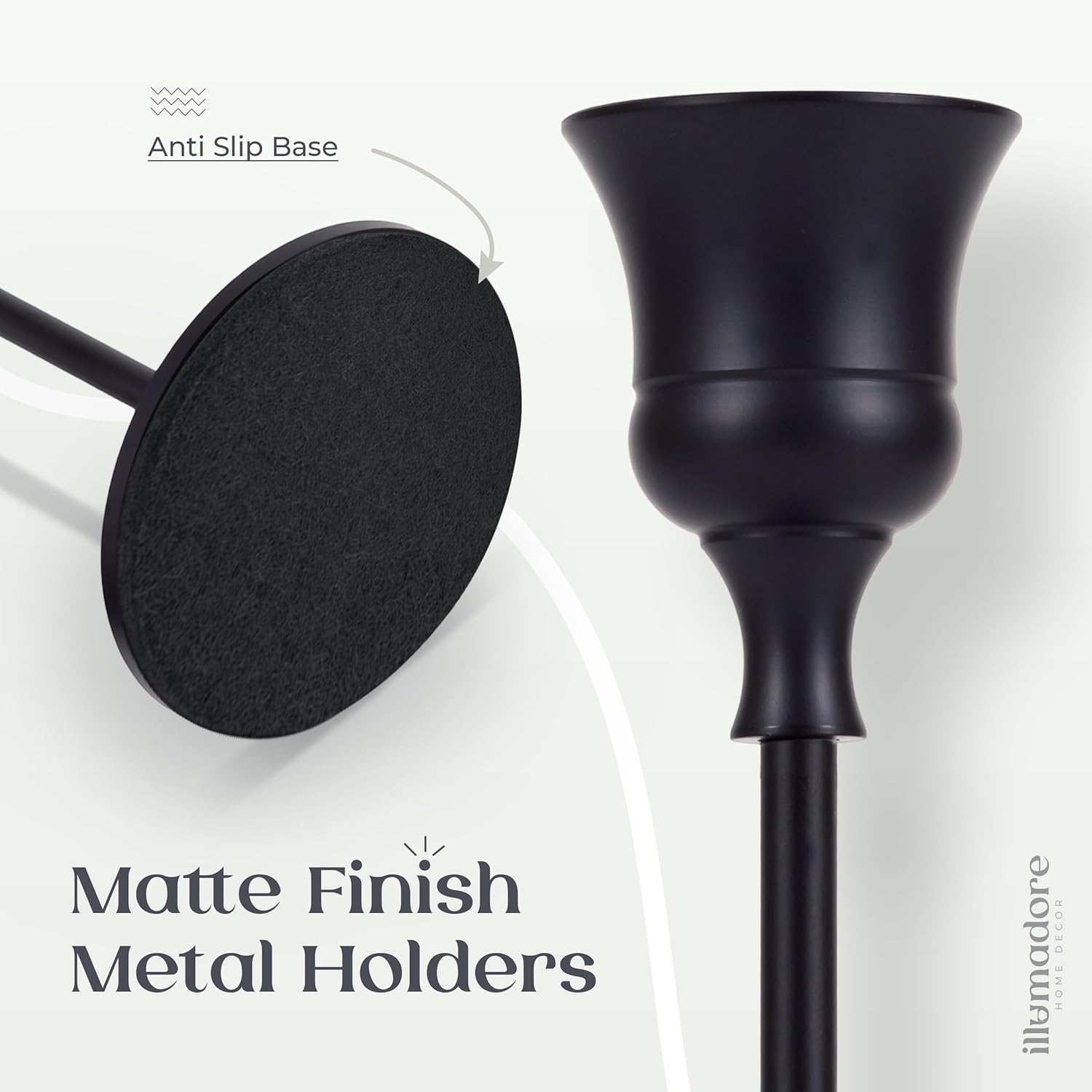 - PREMIUM QUALITY MATERIALS! These holders are crafted from sturdy metal with a sleek black matte finish. Designed to fit 7/8” and 3/4” candles, their high-quality construction ensures lasting durability and a long product life.