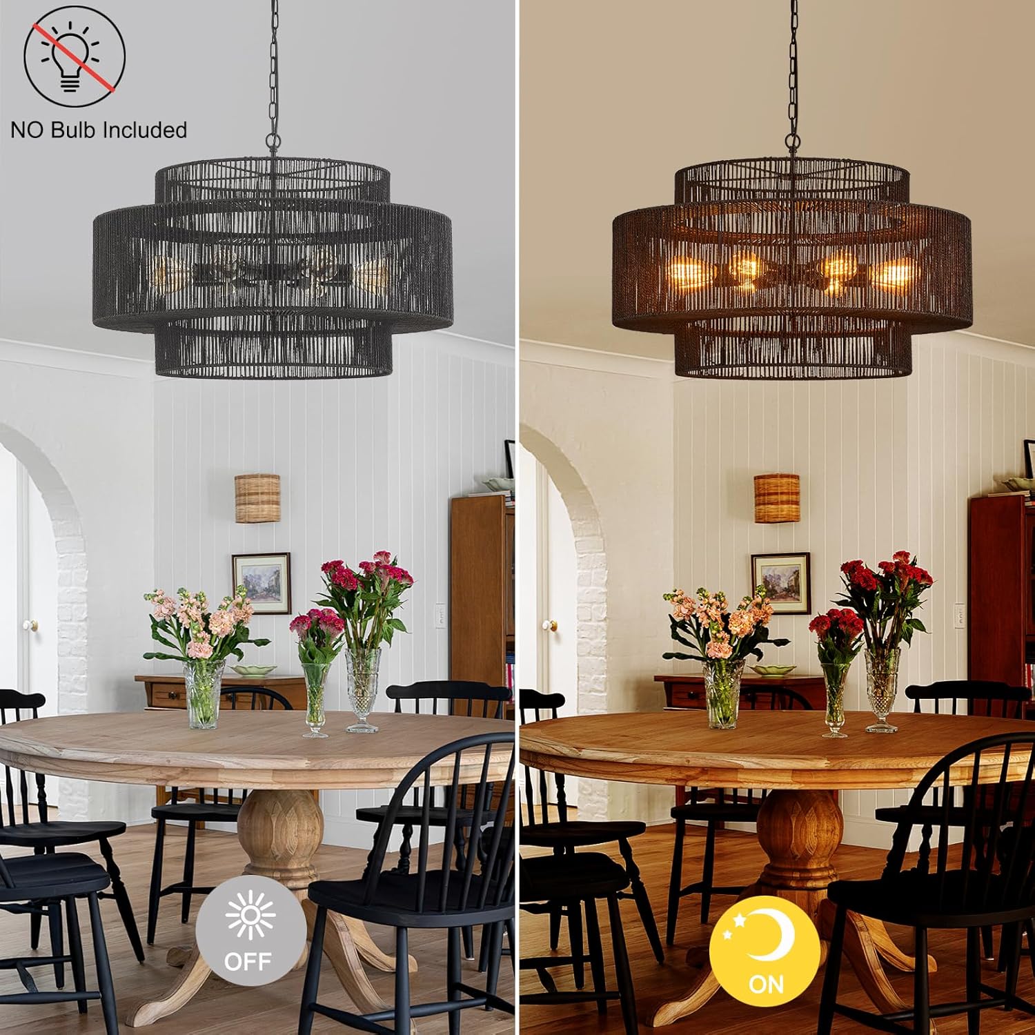 - 【3-Tier Design】The 3-tier rattan black chandelier's simple wicker weave and black finish metal frames bring a vintage bohemian style. This farmhouse chandelier light fixture features three round metal frames that form a captivating semicircular hollow cage. This design sets it apart, adding an element of sophistication.