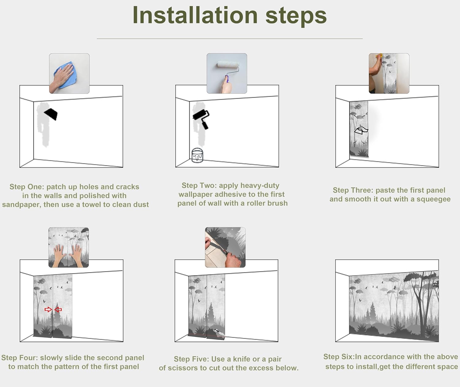 - INSTALLATION - 1.Fill in all cracks or holes and clean dust dirt and grease on the wall surface. 2. Apply the heavy duty wallpaper paste on the wall not mural. 3. Use a spirit level to mark first strip location. 4. match the pattern by sliding into place. 5.use a scraper to smooth out bubbles press. 6. Let dry for a few minutes and that's it! Please Note: Not self-adhesive. We recommend to use a standardized fleece wallpaper paste.