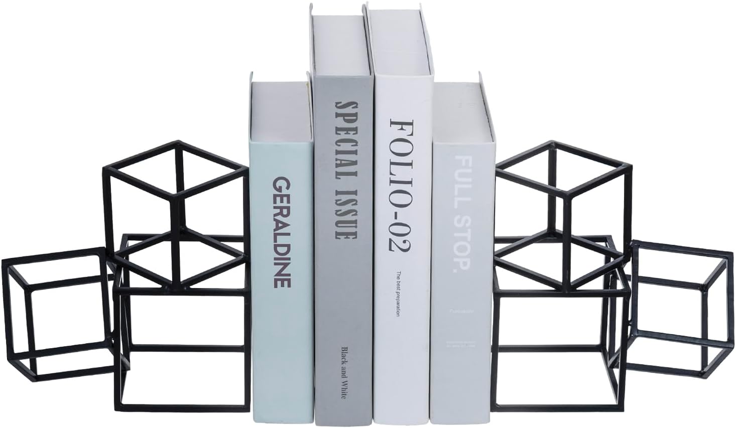 MyGift Modern Matte Black Metal Geometric Bookends in 3 Cube Frame Design, Decorative Book Stands for Home Library Bookshelf Office Desk, 1 Pair, Handcrafted in India