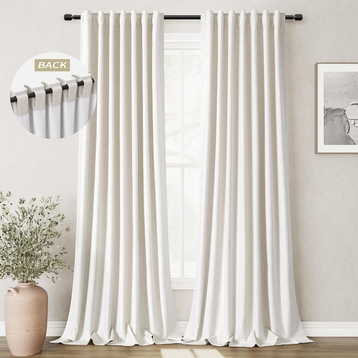 - 3 Hanging Options: Differ from the traditional curtains with grommet, BOODII linen curtains with back tab and rod pocket can full block sunlight fully. (1) Using the back tabs design to create an elegant pleated look and sit closer to the wall than traditional ring curtains, which helps to block out more sunlight; (2) Using rod pocket for a classic effect; (3) Using clip rings on track system or curtain rod, slide open/closed easily (clip rings are not included).