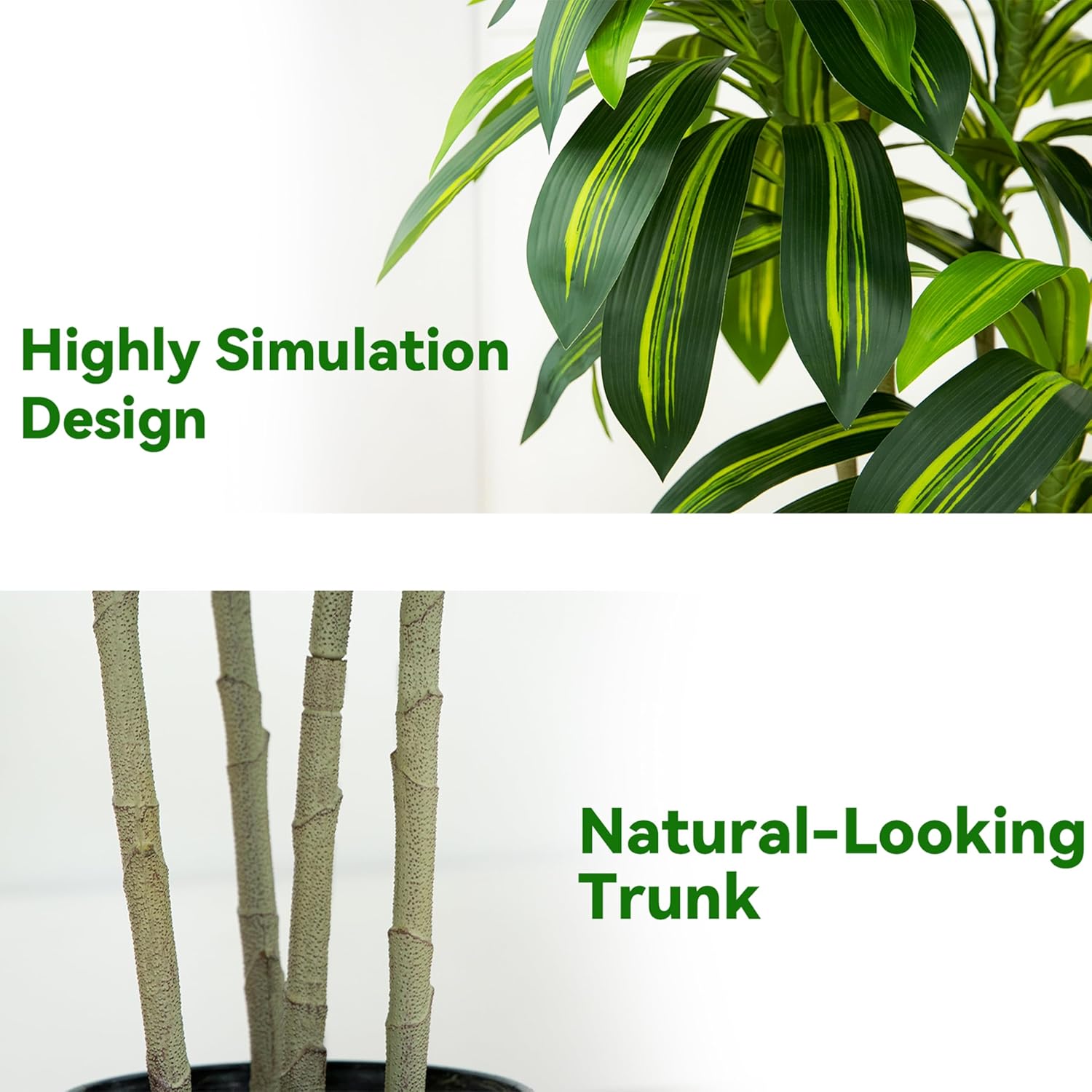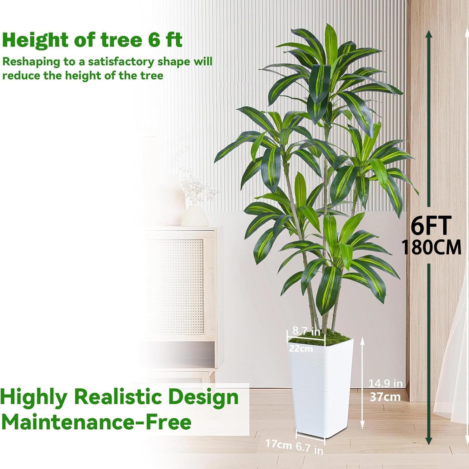 - Why FSOHOI? - It's a artificial dracaena tree with white Tall planter, featuring realistic 5 trunks! These designs give faux dracaena plant a lifelike appearance with realistic texture and look, bringing the beauty of nature right into your home.