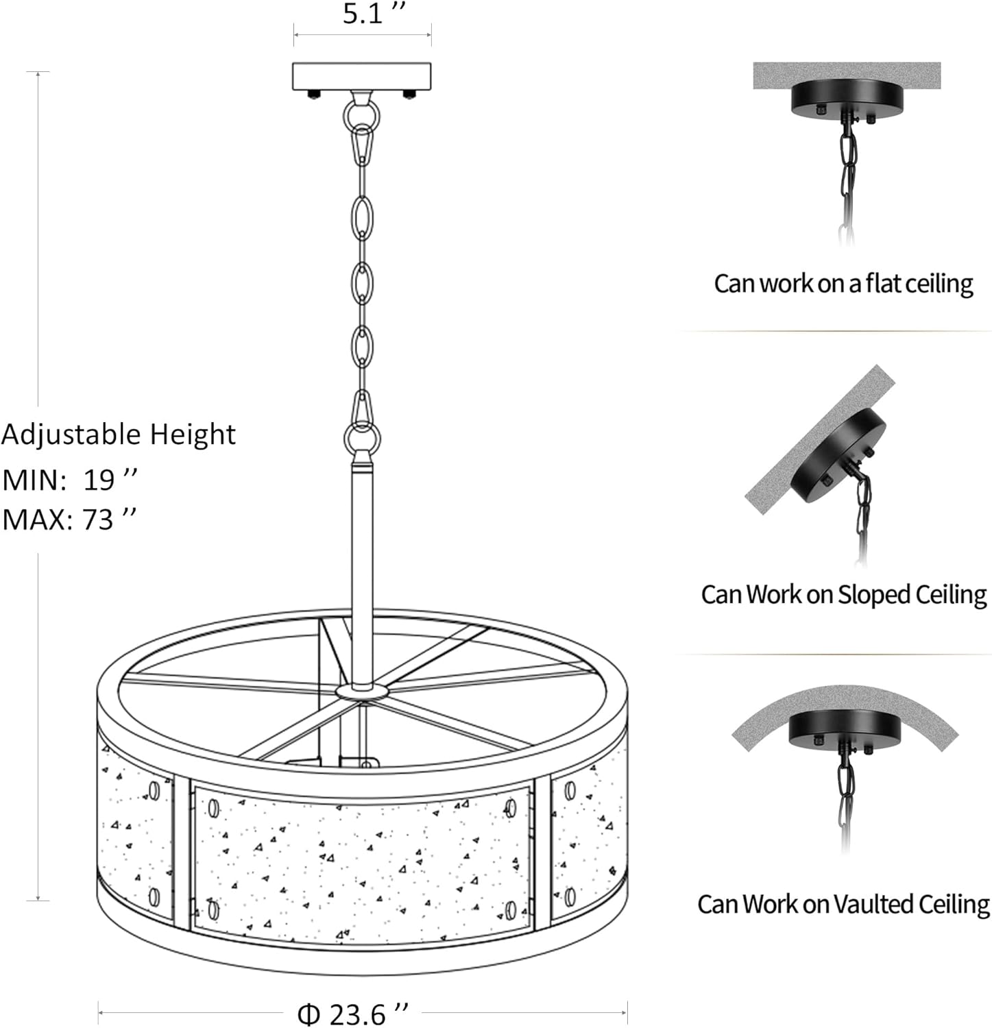 - Adjustable Height: Diameter: 23.6 in, Height: 19-73 in, Canopy Diameter: 5.1 in. Flat,sloped and vaulted ceilingsare compatible. Easily customize the height of this large black chandelier according to your preferences.