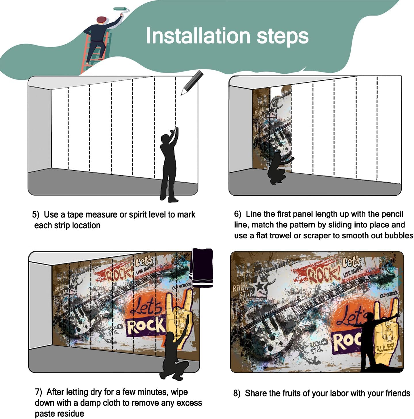 - Mural wallpaper size: 100 "W x 65 "H, divided into 5 sections, each section is labeled with a number underneath, there is no need to overlap the pattern when installing, just install according to the number labeled underneath the panel