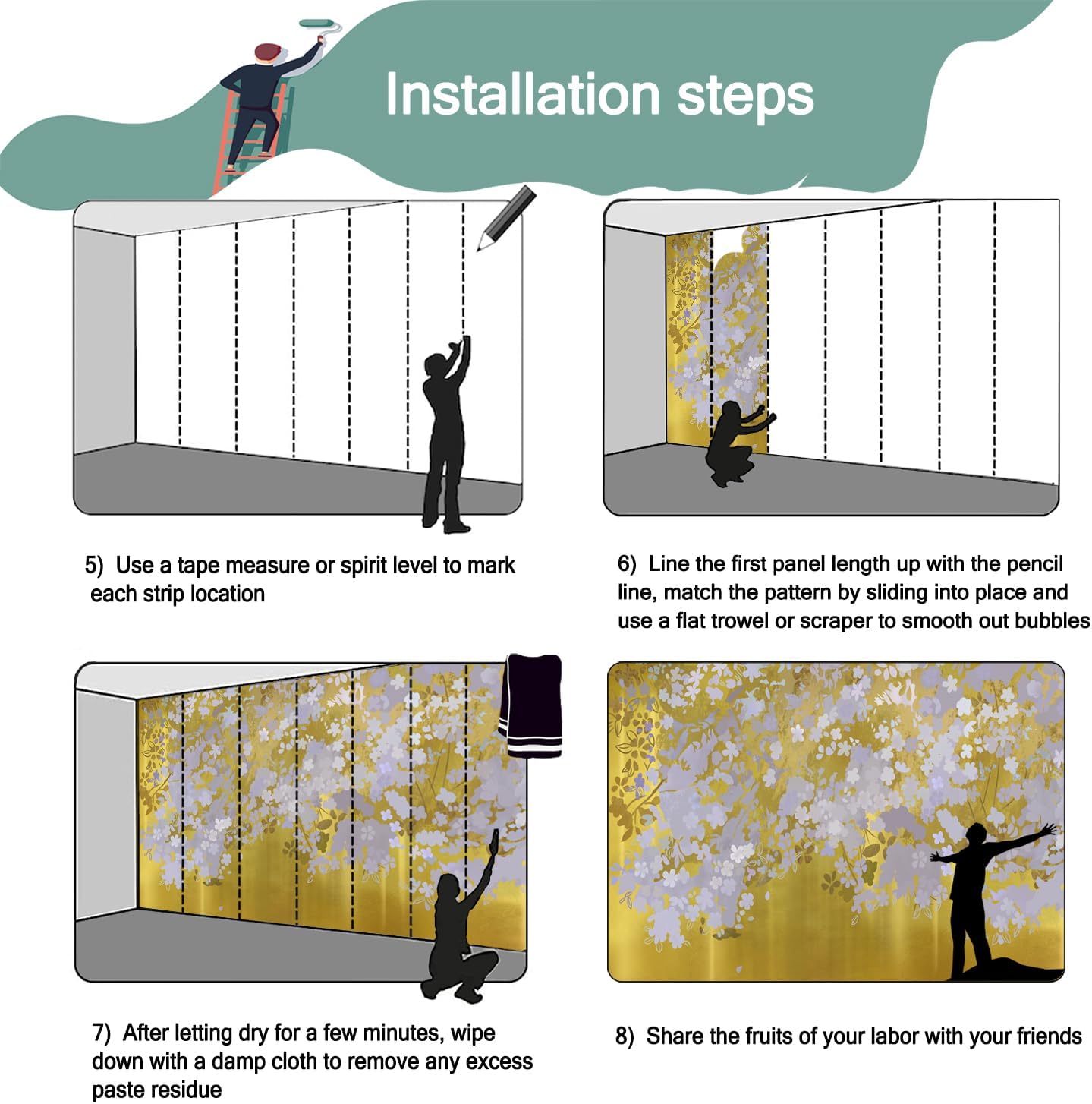 - Mural wallpaper size: 140 "W x 91 "H, divided into 7 sections, each section is labeled with a number underneath, there is no need to overlap the pattern when installing, just install according to the number labeled underneath the panel