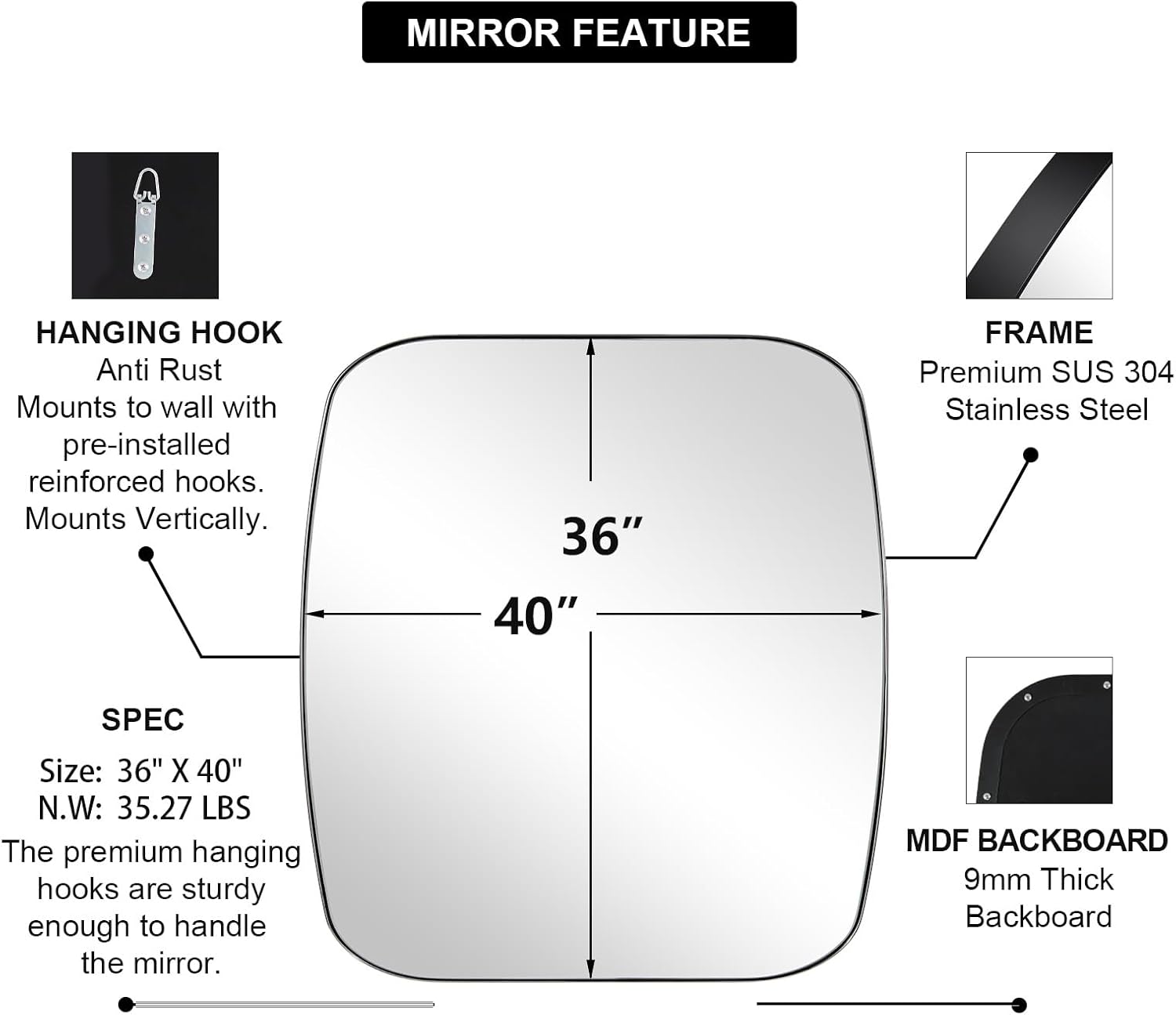 - Transform Spacious Environments: Redesign your spacious bathroom with the large 36x40 inch mirror. Its generous size and premium craftsmanship create a luxurious feel, reflecting light and space to amplify the room's aesthetic appeal and functionality
