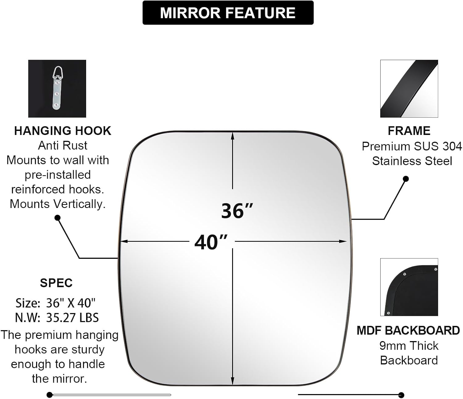 - Transform Spacious Environments: Redesign your spacious bathroom with the large 36x40 inch mirror. Its generous size and premium craftsmanship create a luxurious feel, reflecting light and space to amplify the room's aesthetic appeal and functionality