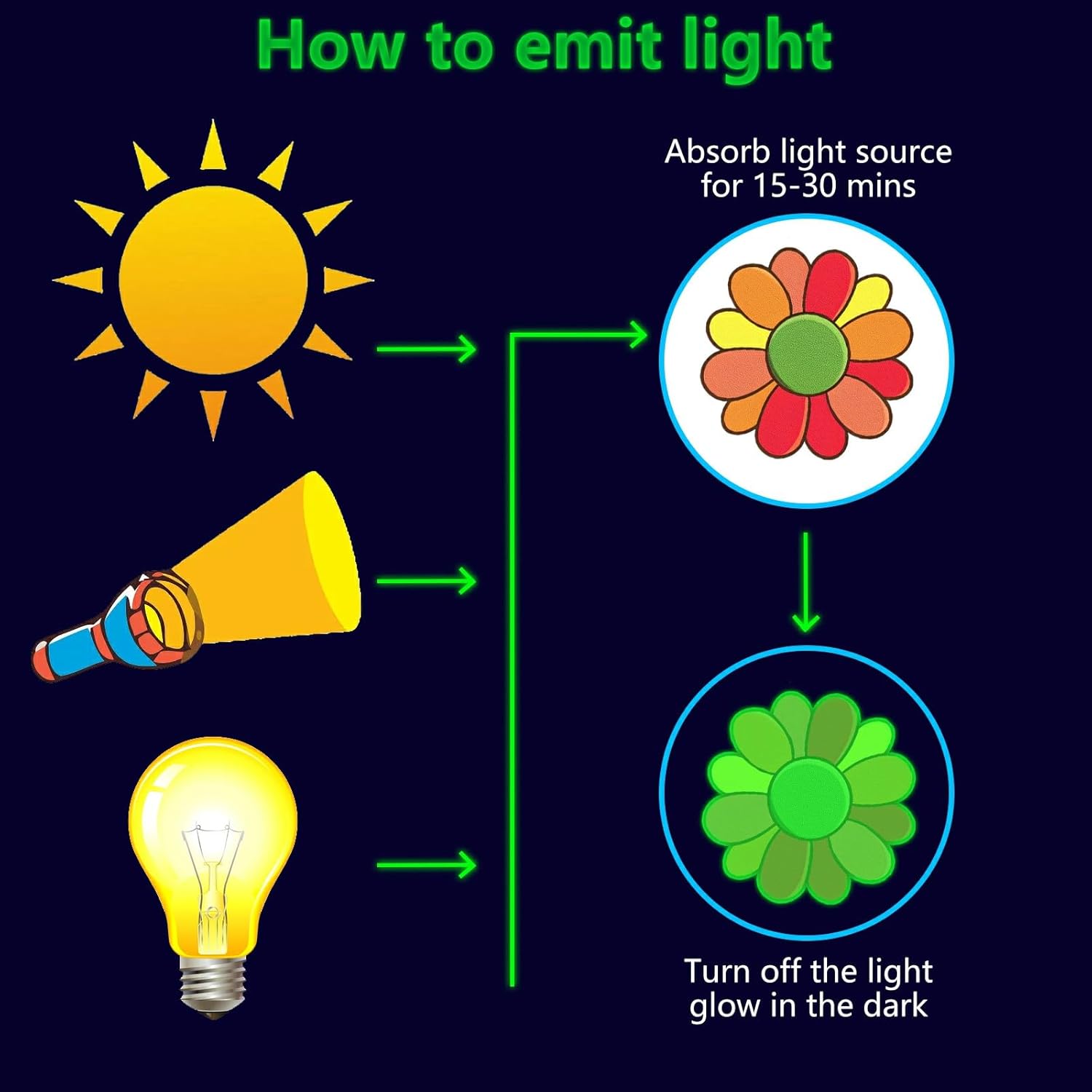 - β¦ Glow Flowers Wall Decals: These glow wall decals for ceiling are made of quality luminous material,they will glow brightly when absorb enough light during the day. You just need to put it under lamplight flashlight ,room light or sunshine for 15 minutes, it will keep glowing for 8-10 hours with a gentle green fluorescent light. Please ensure the light shines on the decals without obstruction, the longer it takes to absorb light, then to light up for up to longer.