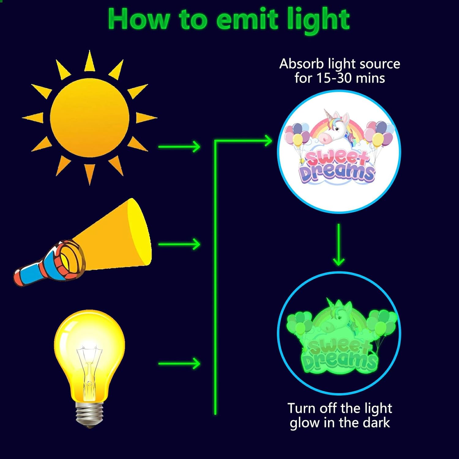 - β¦ Glow Unicorn Wall Decals: These glow wall decals for ceiling are made of quality luminous material,they will glow brightly when absorb enough light during the day. You just need to put it under lamplight flashlight ,room light or sunshine for 15 minutes, it will keep glowing for 8-10 hours with a gentle green fluorescent light. Please ensure the light shines on the decals without obstruction, the longer it takes to absorb light, then to light up for up to longer.