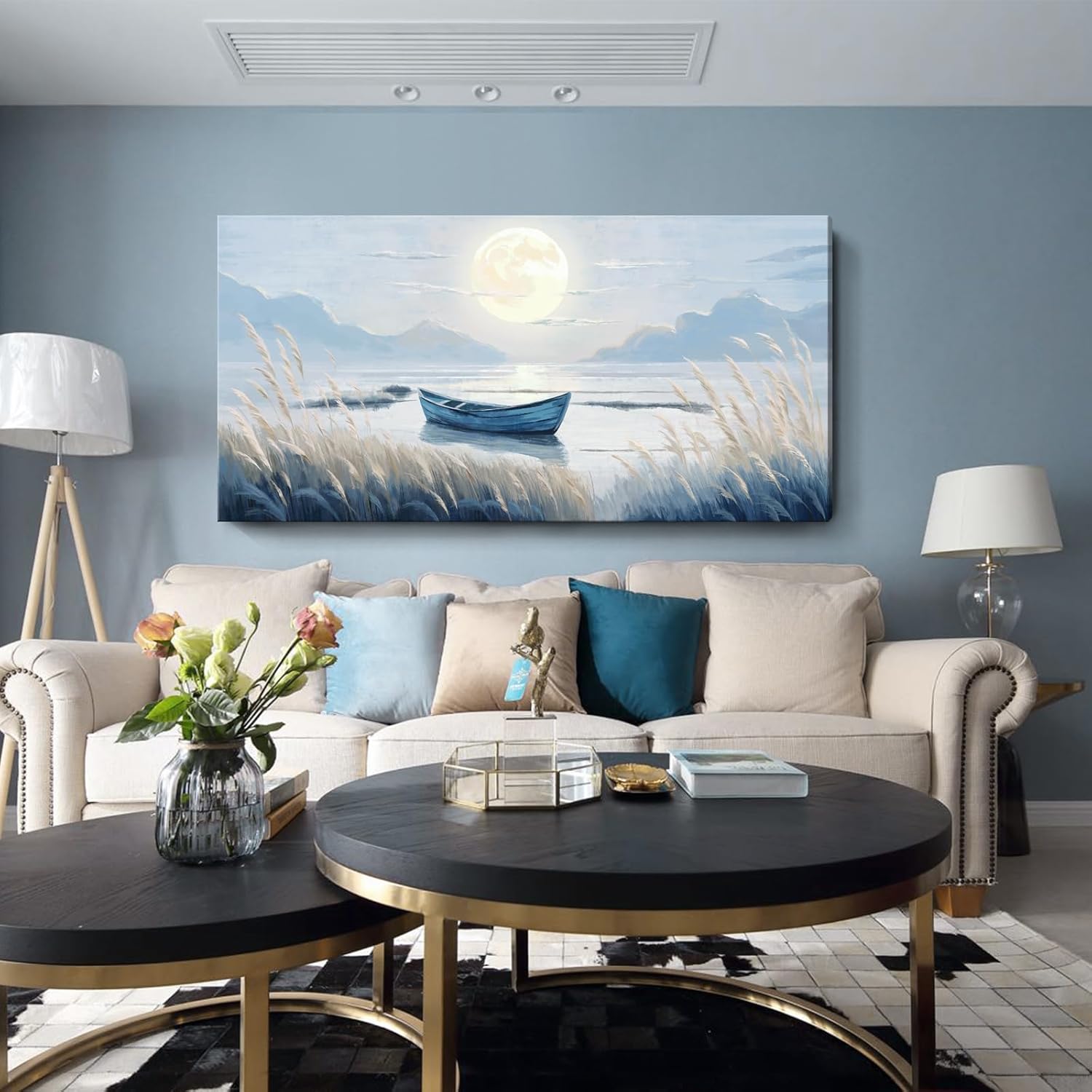 - Tranquil Wall Art for Every Space: Transform your space with this stunning large coastal wall art, featuring a serene moonlit lake, a glowing moon, and a peaceful boat. Perfect for infusing a touch of beach-inspired elegance into your living room, bedroom, dining room, or office. Whether you're seeking a calming focal point or a soothing atmosphere, this extra large blue and white artwork effortlessly enhances any room with its tranquil beauty.