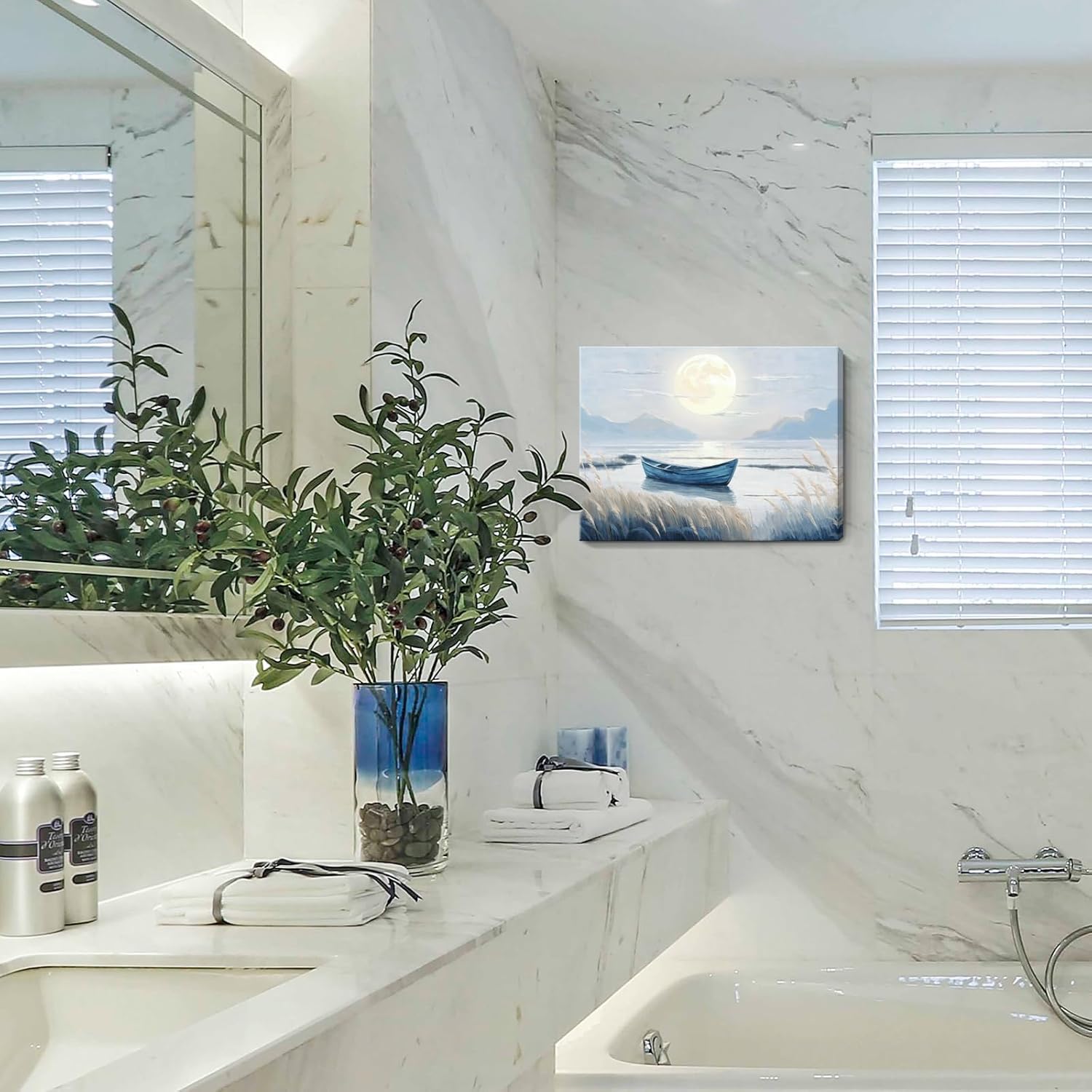 - Tranquil Wall Art for Every Space. Transform your walls with this stunning coastal canvas wall art featuring a peaceful moonlit lake, glowing moon, and a serene boat. Perfect for adding nature-inspired elegance to your bathroom, kitchen, bedroom, or office décor