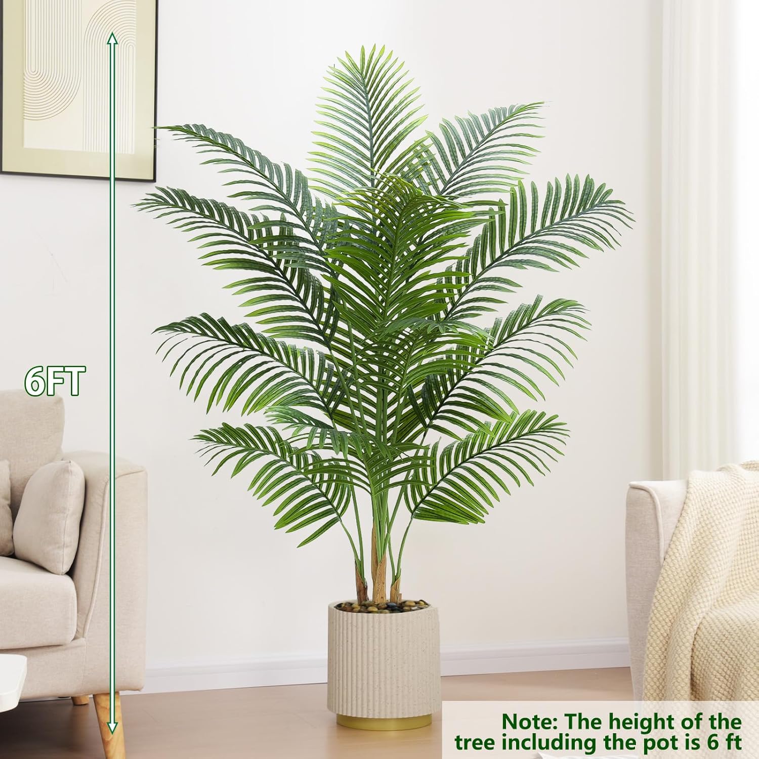 - Home Decor Accents: This 6ft/180cm tall artificial palm tree has 18 smooth pristine trunks connected with up to 580 arching feather-like leaves with realistic texture. Inclus a white planter(7"H x 7"W). The interior of the planter is made of sturdy cement and the surface is decorated with non-falling coloured pebbles and the base is weighted for greater stability