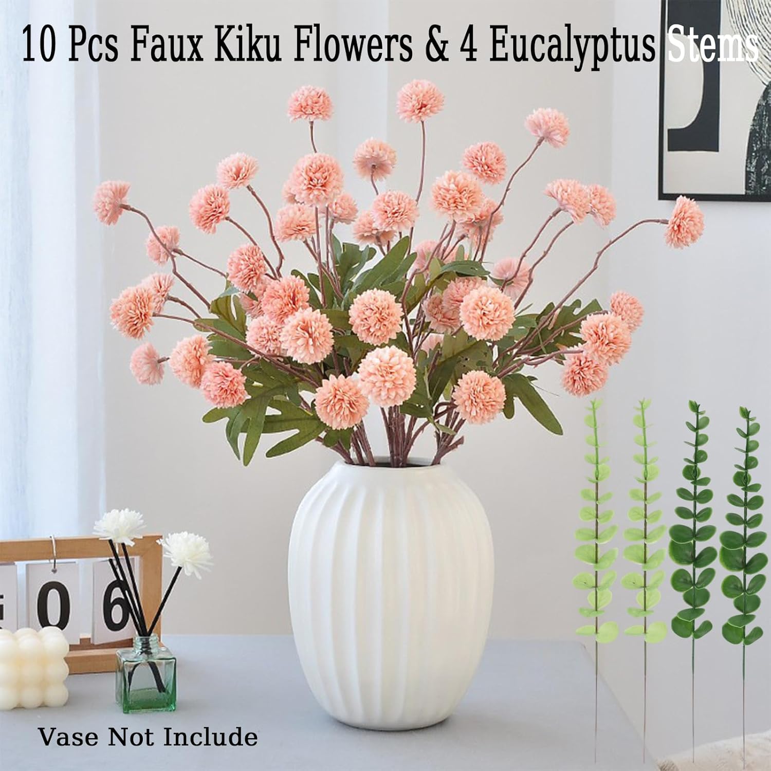- Realistic Artificial Plants and Flowers in Bulk: Featuring lifelike faux kiku flowers, including chrysanthemum ball blooms and delicate kiku flowers, this bouquet mimics the beauty of real flowers while offering long-lasting appeal. Paired with eucalyptus branches and artificial plant stems, this arrangement is perfect for table centerpieces or vase decorations. With their fresh appearance and durability, these faux flowers are an eco-friendly and sustainable choice for any floral decor