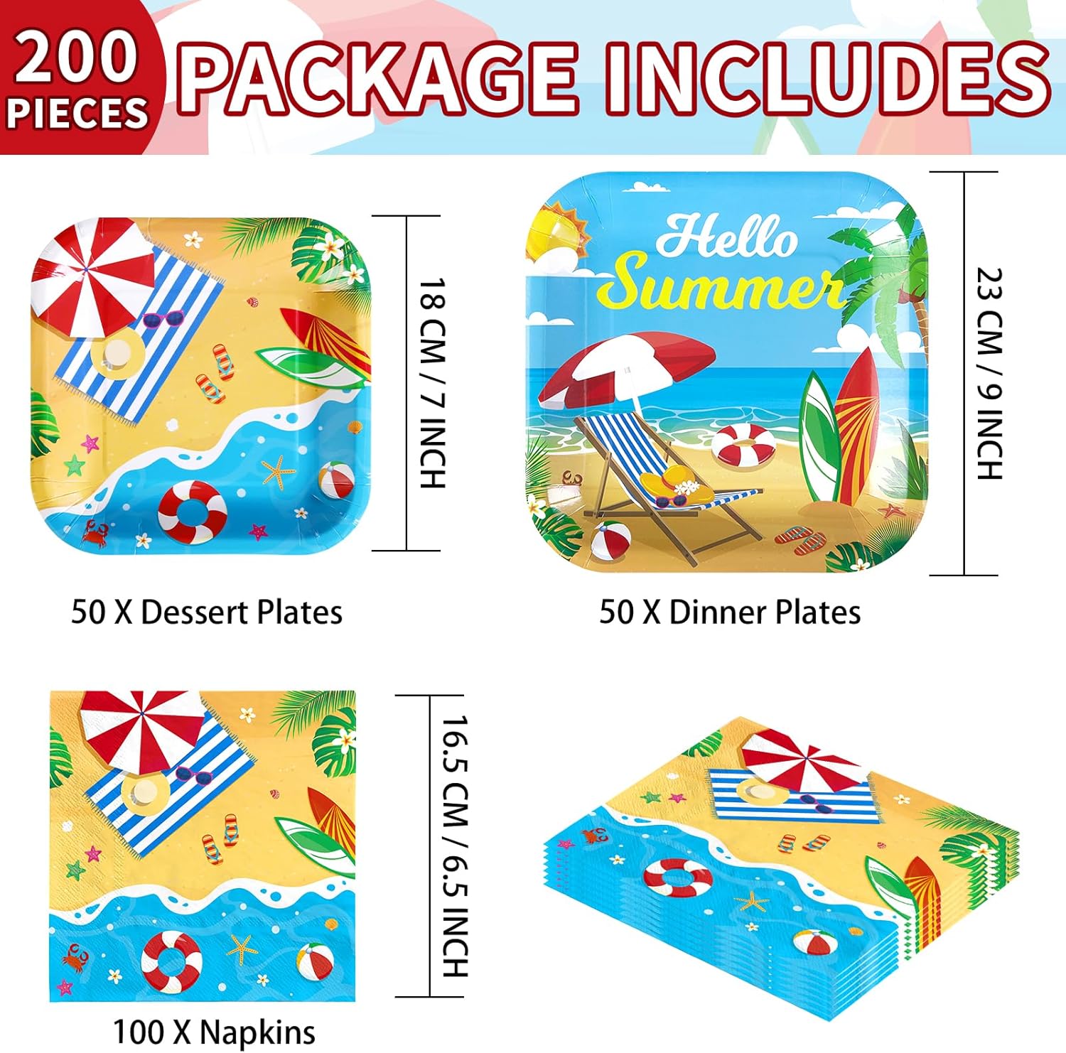 - Summer Beach Party Decorations: We've prepared attractive hello summer beach tableware kit! 200PCS hello summer tableware set includ 50pcs 9" square hello summer party plates, 50pcs 7" square beach plates, 100pcs summer beach napkins, they will add the taste of cheerful summer party decorations. Add some fun and beachy vibes to your summer party with these Sun & Surf Beach Dinner Tableware, you can be sure that your party will get more fun