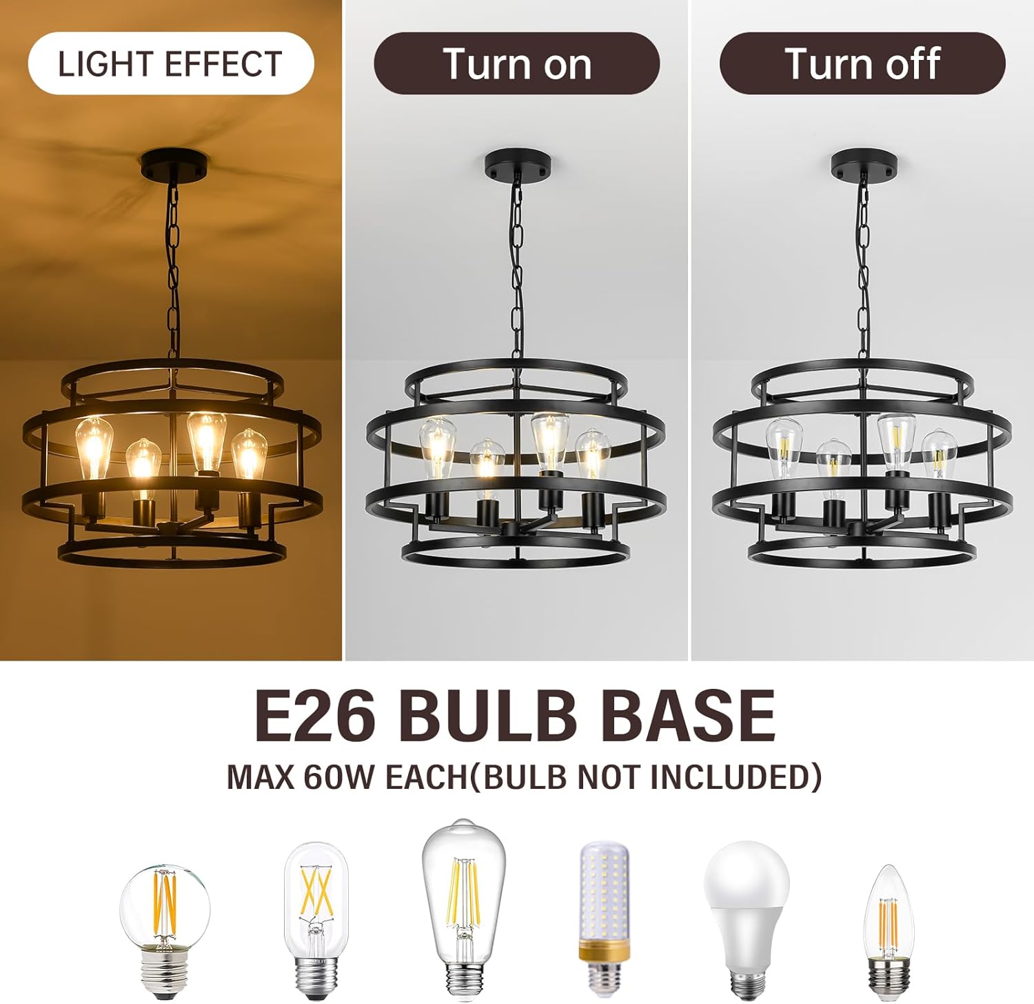 - Versatile & Bulb Compatibility - Black chandeliers for dining room are equipped with 4* E26 sockets, making them compatible with various bulbs including incandescent, halogen, and LED (60W Max, Not Included). Semi flush mount ceiling light fixture can be dimmable with compatible bulbs or dimmer switches, it's the ideal lighting solution for large farmhouses, kitchens, living rooms, bedrooms, restaurants, etc. You can customize lighting ambiance with different bulb styles and color temperatures.