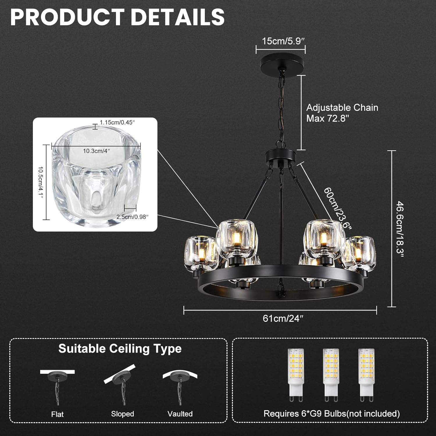 - 【6-Light Chandelier】Black wagon wheel chandelier offers 360° light coverage to brighten your space & create a cozy vibe. The round chandeliers for dining room requires 6 G9 bulbs and available for infinite dimming via a dimmer. (Dimmable bulbs & dimmer not included).