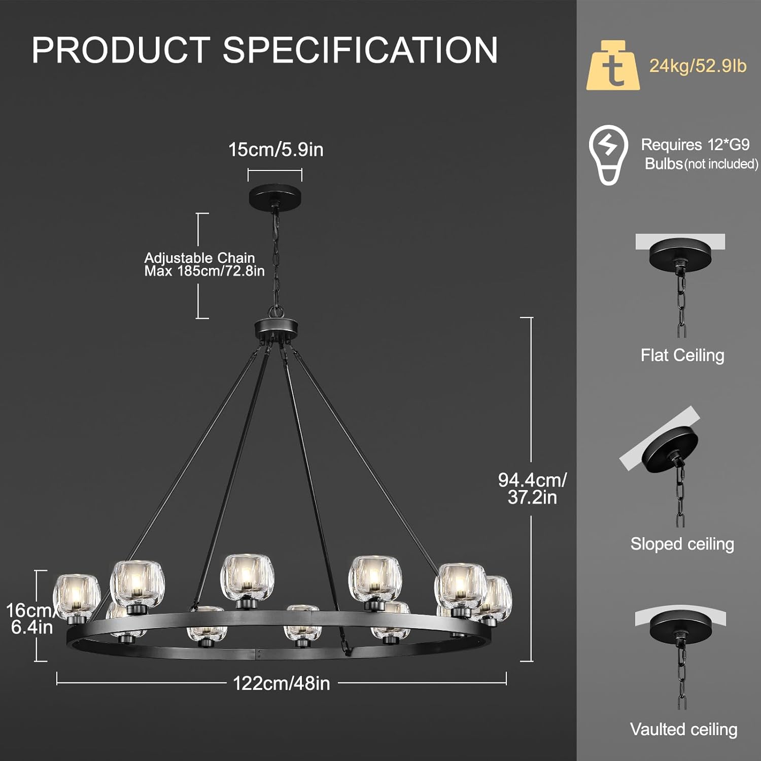- 【12-Light Chandelier】Black wagon wheel chandelier offers 360° light coverage to brighten your space & create a cozy vibe. The round chandeliers for dining room requires 12 G9 bulbs and available for infinite dimming via a dimmer. (Dimmable bulbs & dimmer not included).