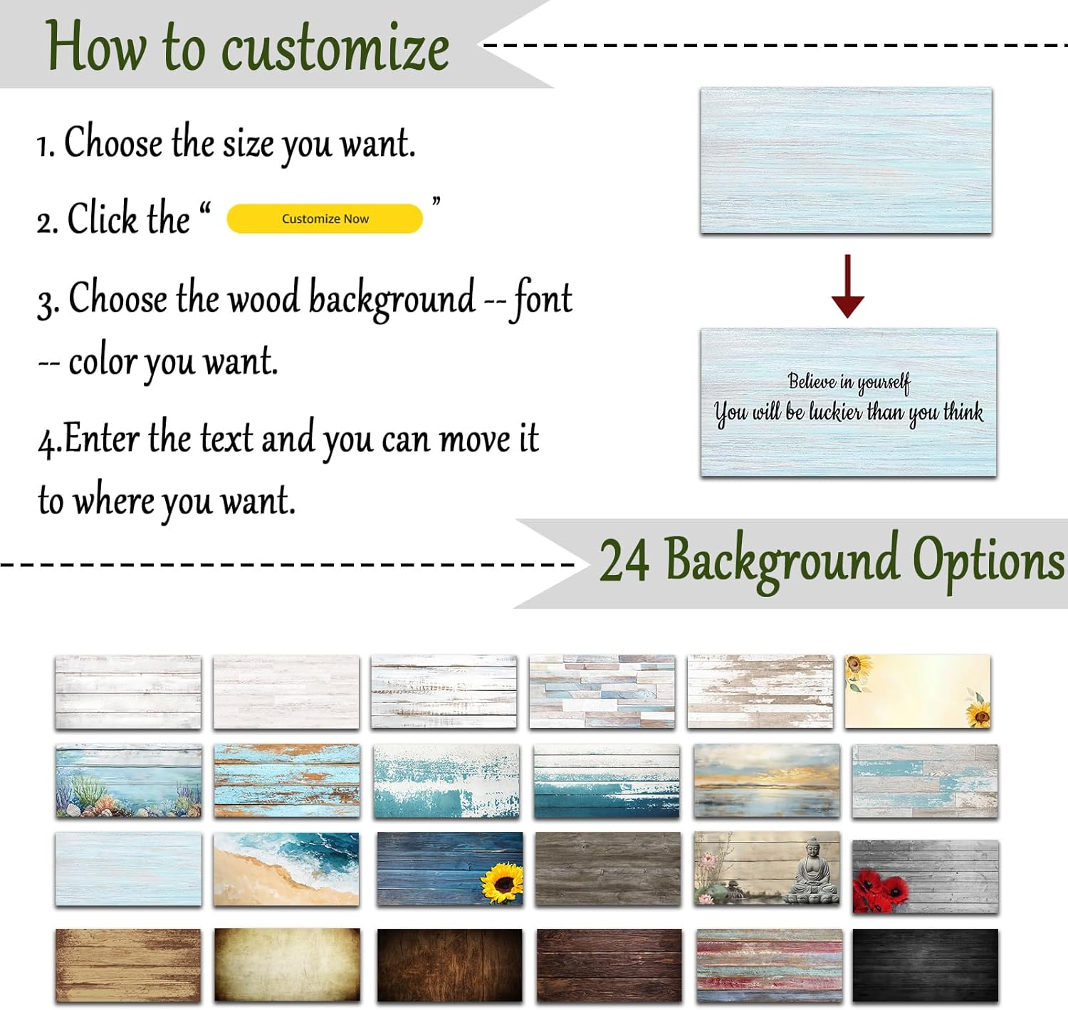 - Custom Sign Pictures for Wall -- Click "Customize Now" to select your desired wood background, font and font color, enter your desired text. The font and color can be selected as you like. We will create a customized sign for you based on your customized preview image.