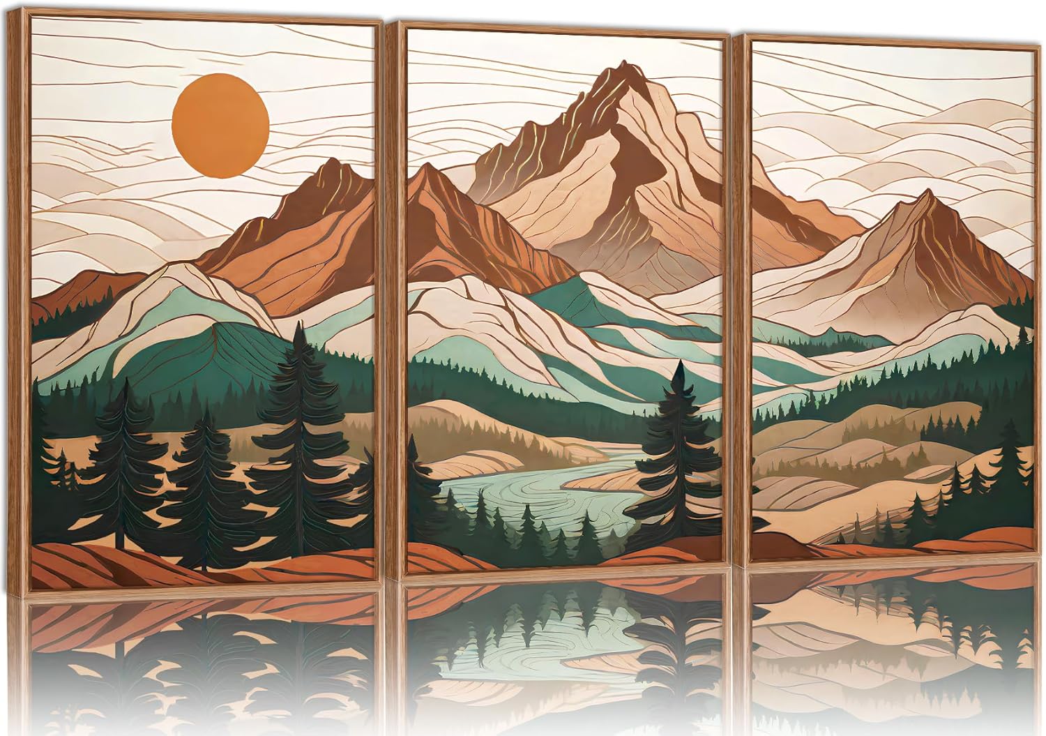 Tinonedraw Mountain Framed Canvas Wall Art Set of 3, Sunrise Forest Woodland Landscape Art Prints, Boho Coloful Ridge Scenery Wall Decor, Wood Pine Wilderness Art Paintings for Living Room Bedroom, Office 16"x24"