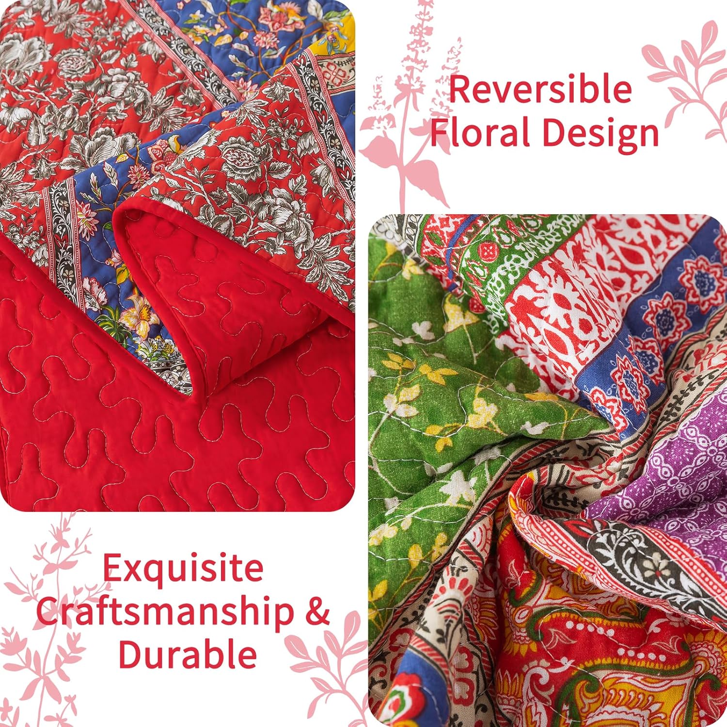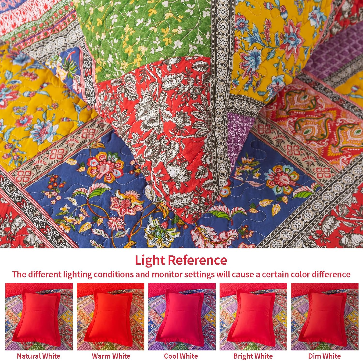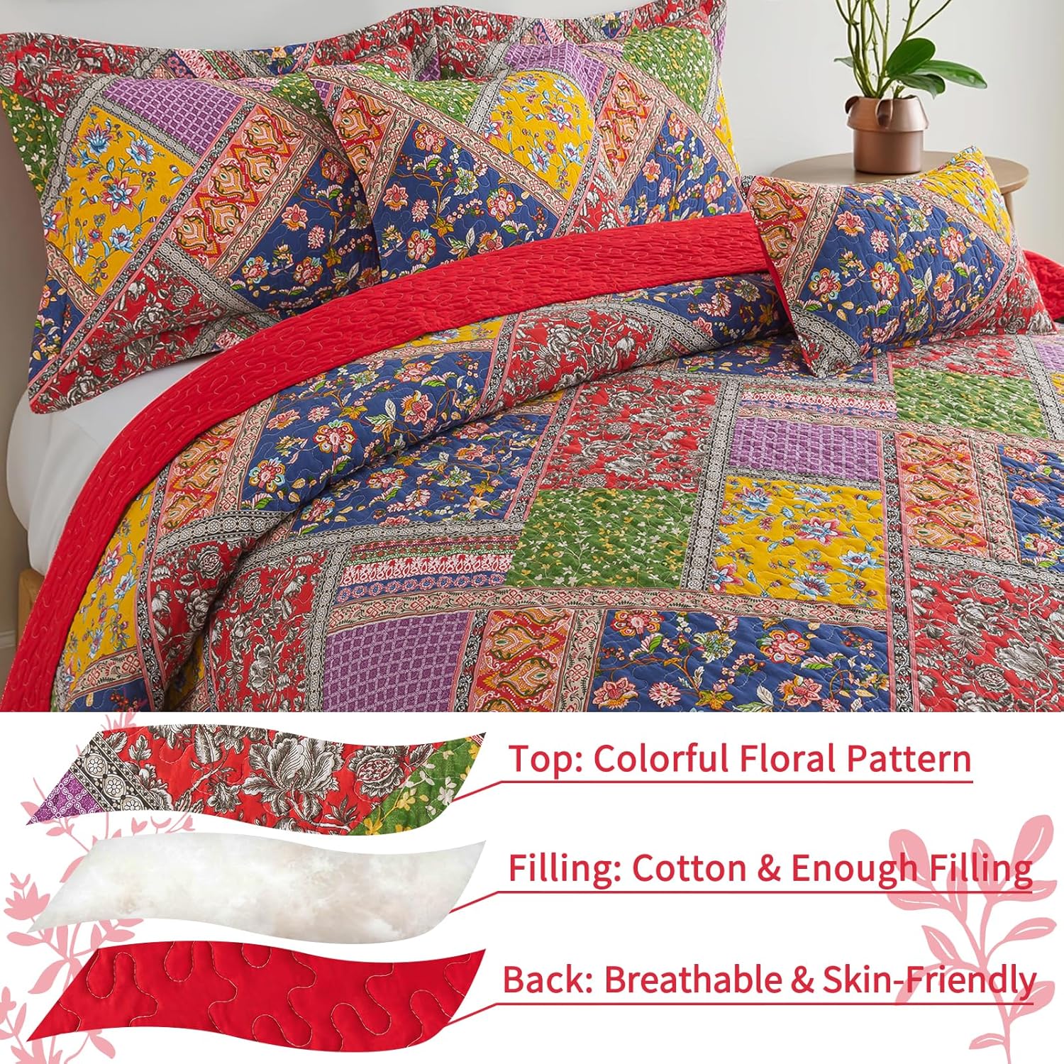 - 【Exquisite home decoration】 Classic patchwork pattern design, using three main colors of red, blue, and yellow to match other floral patterns, forming a unique picture scroll, adding a strong rural style to your bedroom, allowing you to immerse yourself in nature and enjoy a peaceful and comfortable sleep.