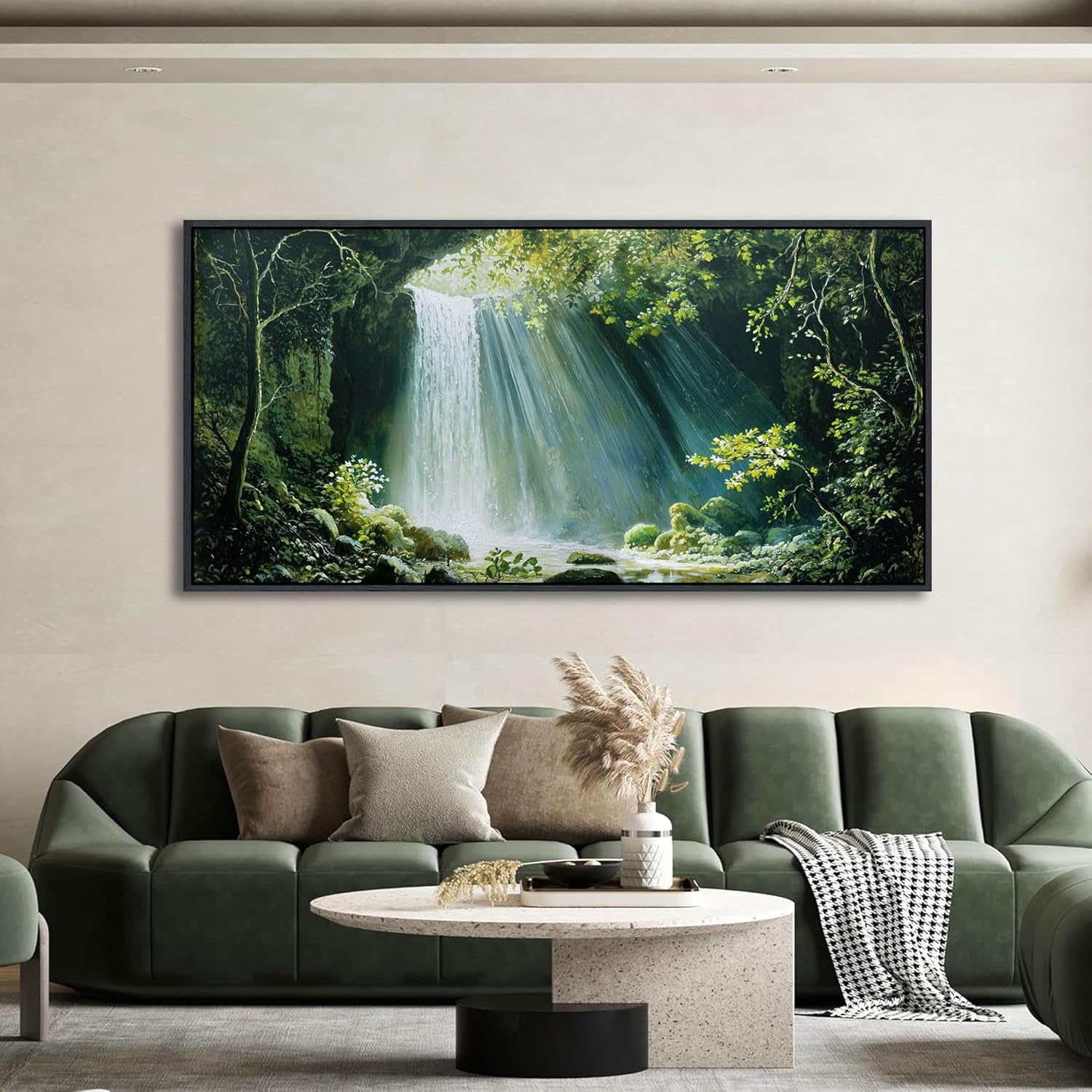 - Enchanting Natural Scenery: This landscape wall art captures a lush waterfall and forest, perfect as wall art for living room or wall art for office spaces. Sunlight filtering through foliage enhances its serene botanical wall art charm, immersing viewers in nature’s tranquility.