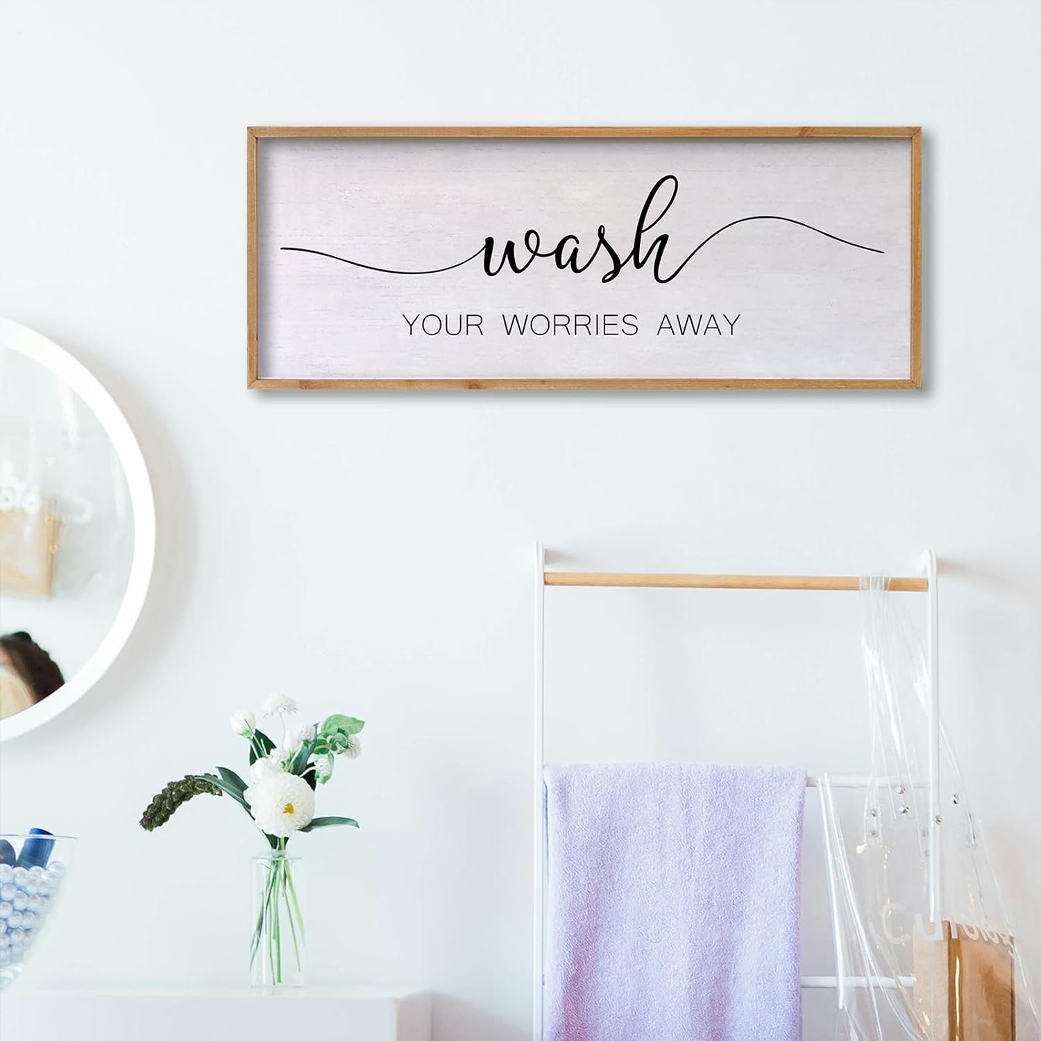 Wash Your Worries Away Bathroom Wall Art 24×10 Inch Wood Framed Decor Funny for Laundry Room Restroom Modern Rustic Inspirational Sign (Wood)