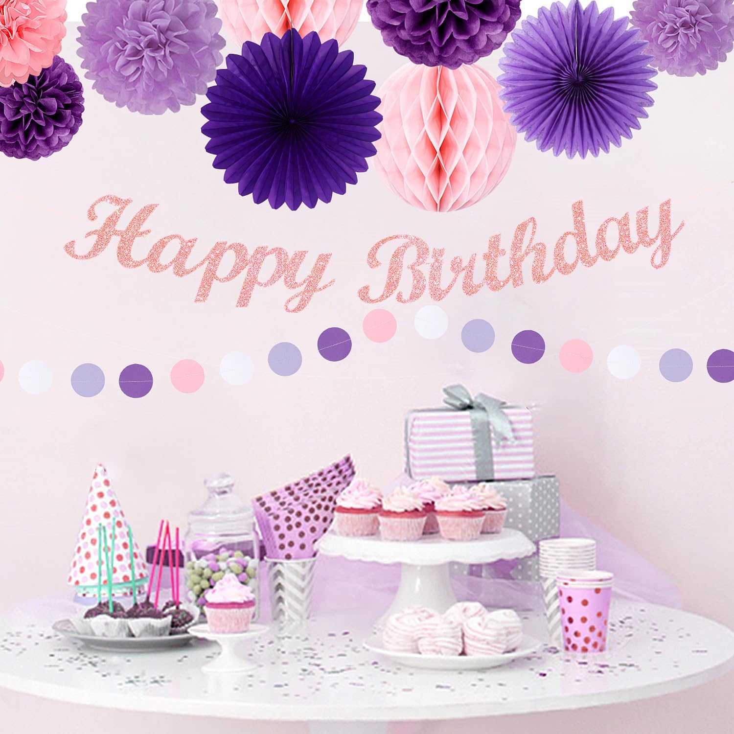 - 【Purple pink birthday decorations kit includes】The party decorations kits include 8pcs purple pink paper flower, 2pcs purple paper fans,2pcs 8" pink paper Honeycomb, happy birthday garland and purple pink streamers.