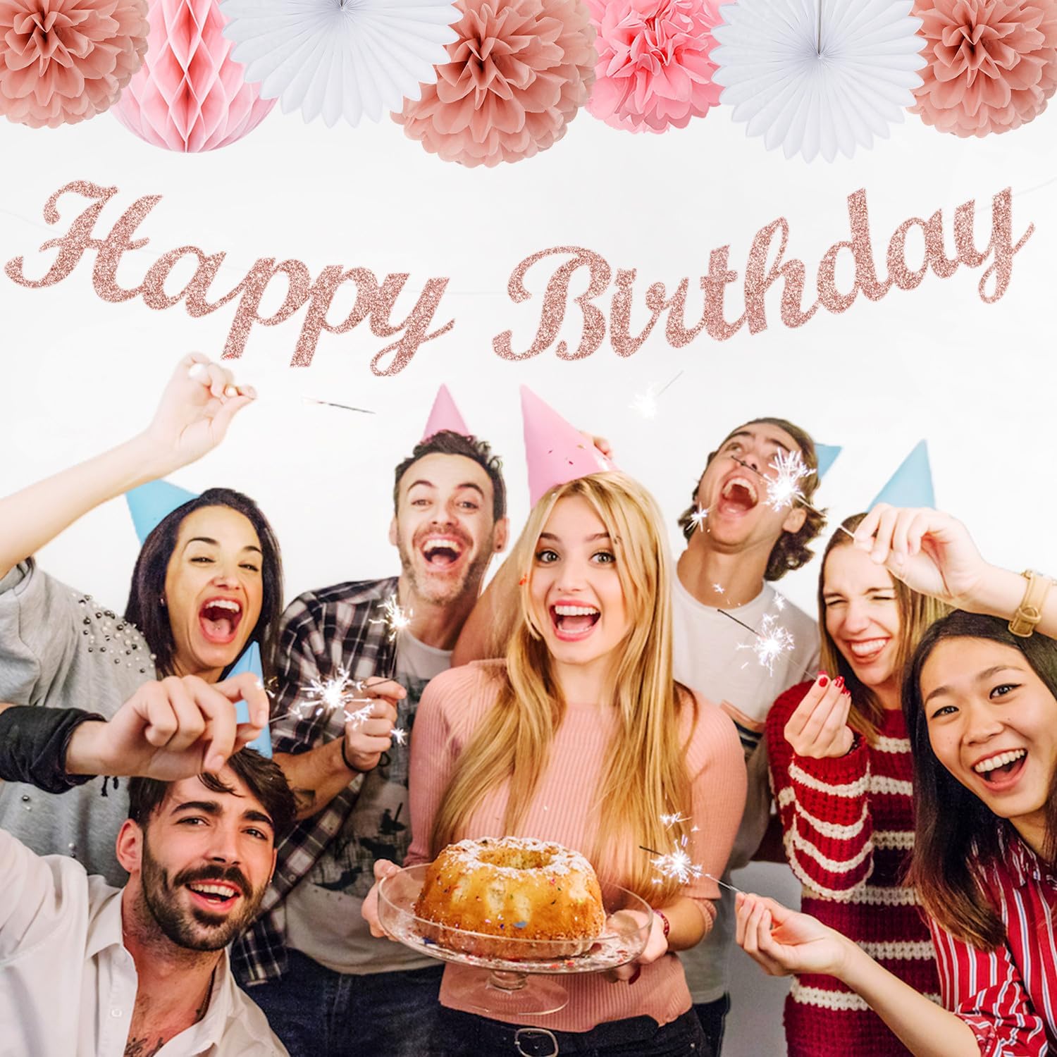 Light-Pink Rose-Gold Birthday Garland Party-Decorations - 14pcs Happy Banner Women Paper Flowers Lanterns Tissue Pom Poms,Streamers Fans Honeycomb Girls Adult Women Kids Hanging Supplies Decor Hugfond
