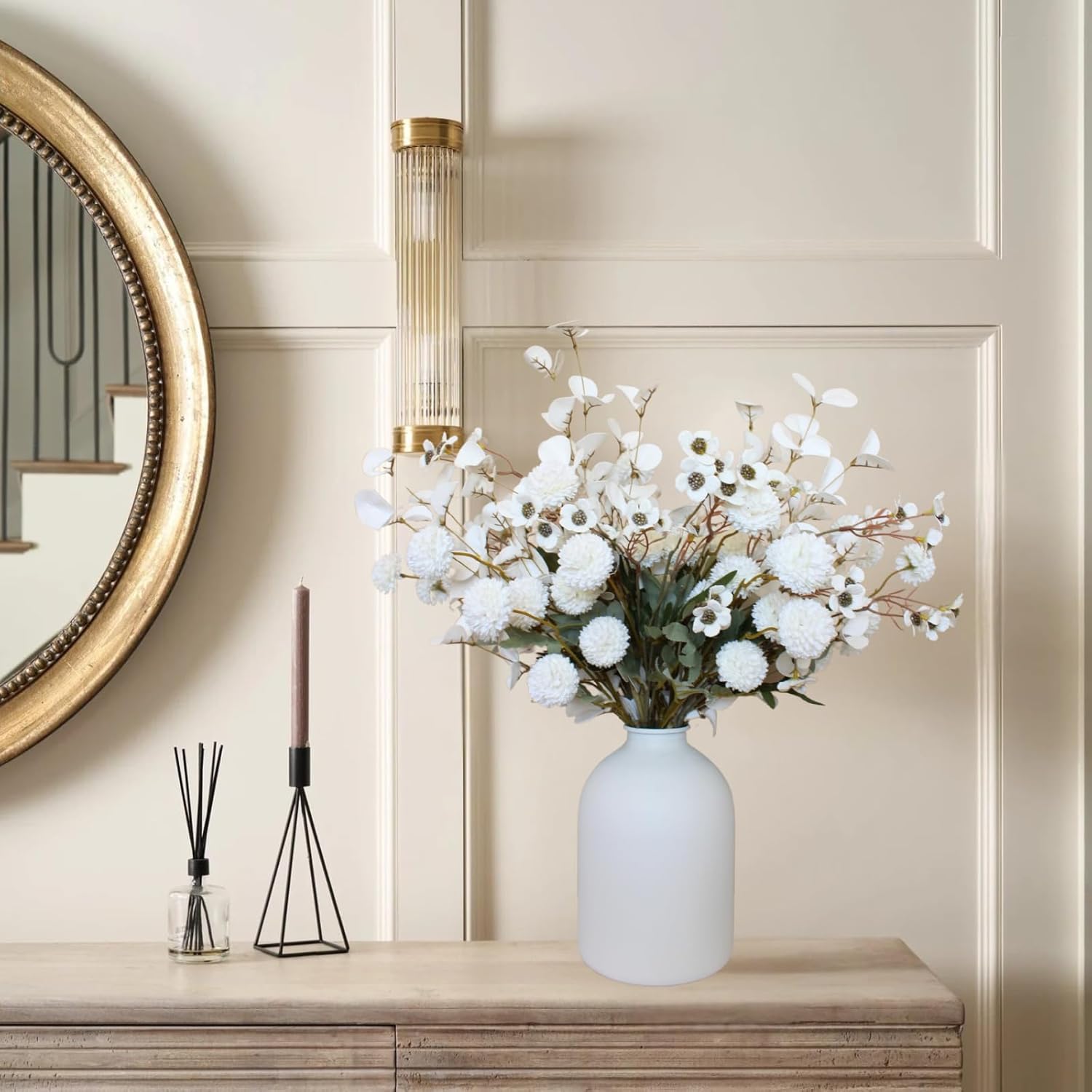 - Bulk White Flower Centerpieces for Tables with Lasting Beauty: Crafted as artificial flowers for centerpieces, this set features faux mums with long stems, fake wild flowers arrangement, and white eucalyptus stems. Ideal as table decor centerpieces, these realistic fake flowers offering a durable, no-watering option for kitchen dining areas, entryways, or wedding setups with a fresh, white floral aesthetic.