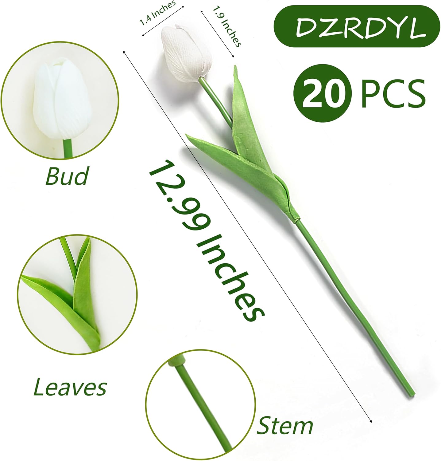 - [Packaging and Size]: The total length of the artificial flowers tulips is 12.9 inches. The tulip buds are approximately 2 inches high and about 1.4 inches in diameter.