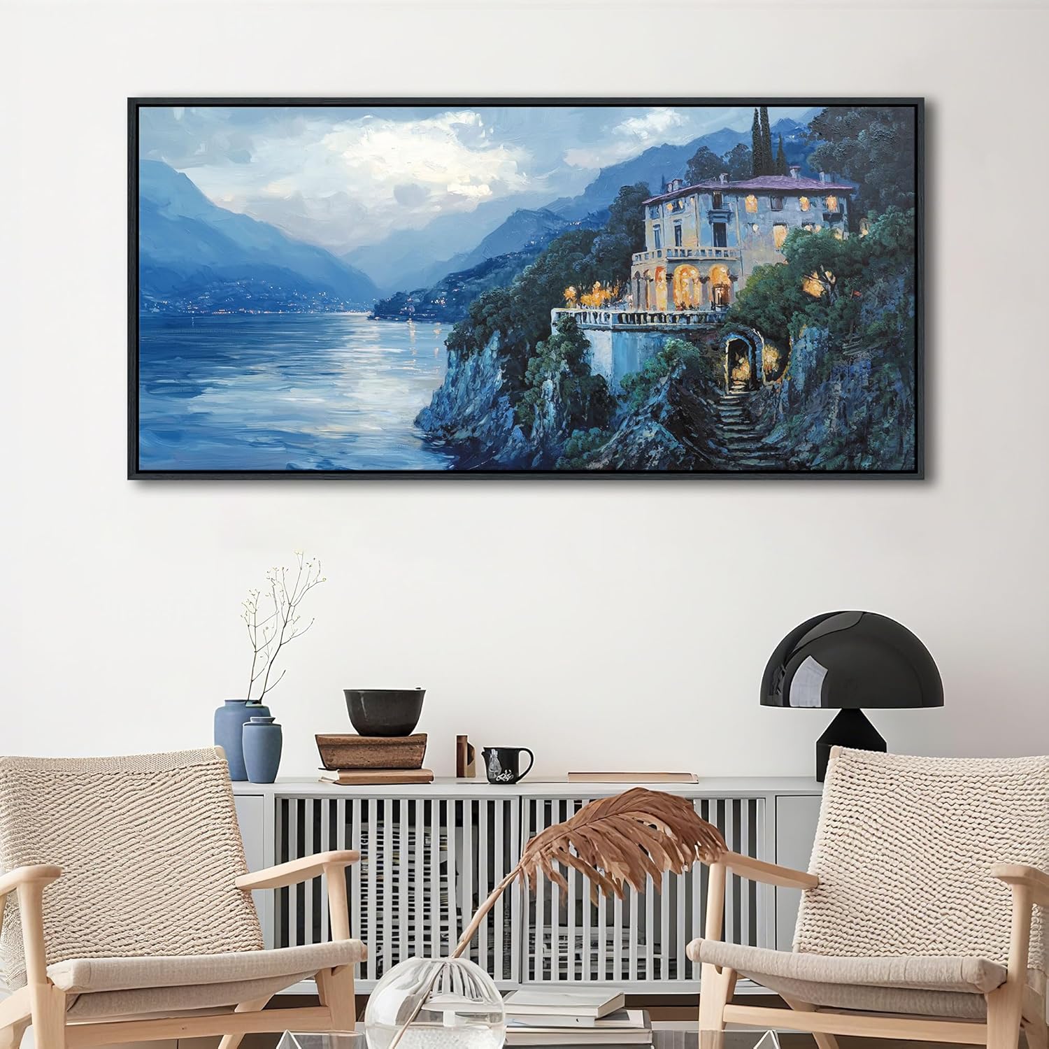 - Wall Art for Living Room: This oil paintings showcases a captivating scene of a lakeside villa bathed in warm lights against a backdrop of mountains and water. The rich, vivid colors and masterful brushstrokes create a lifelike and immersive view that can transform any room into a tranquil retreat.