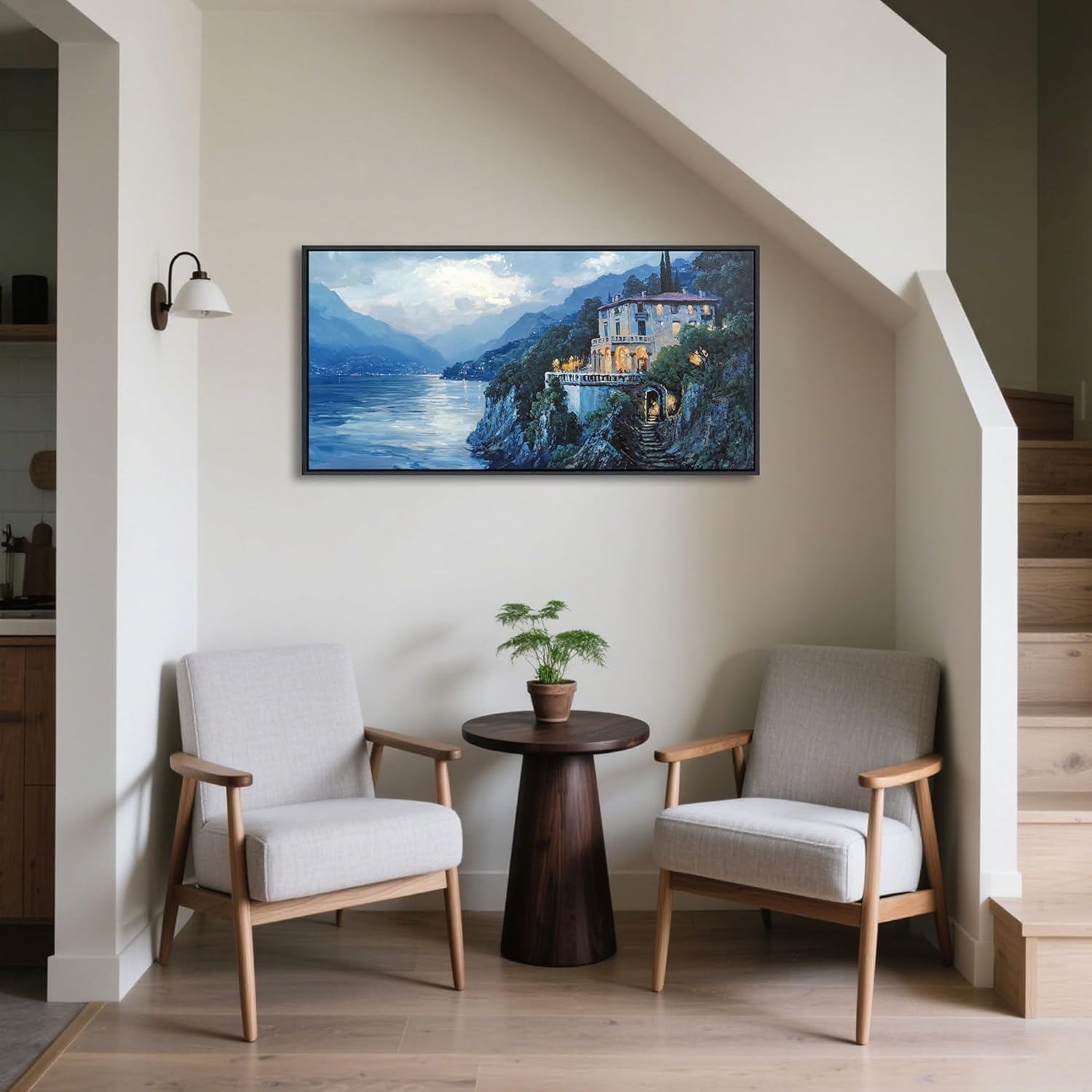 - Wall Art for Living Room: This oil paintings showcases a captivating scene of a lakeside villa bathed in warm lights against a backdrop of mountains and water. The rich, vivid colors and masterful brushstrokes create a lifelike and immersive view that can transform any room into a tranquil retreat.