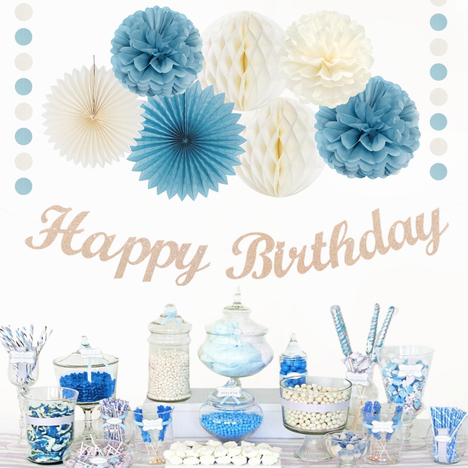 Dusty-Blue White Birthday Party-Decorations Paper-Flowers - 14pcs Happy Banner Boy Lanterns Tissue Pom Poms,Men Streamers Garland Fans Honeycomb,Baby Teen Male Kids Hanging Supplies Decor Hugfond