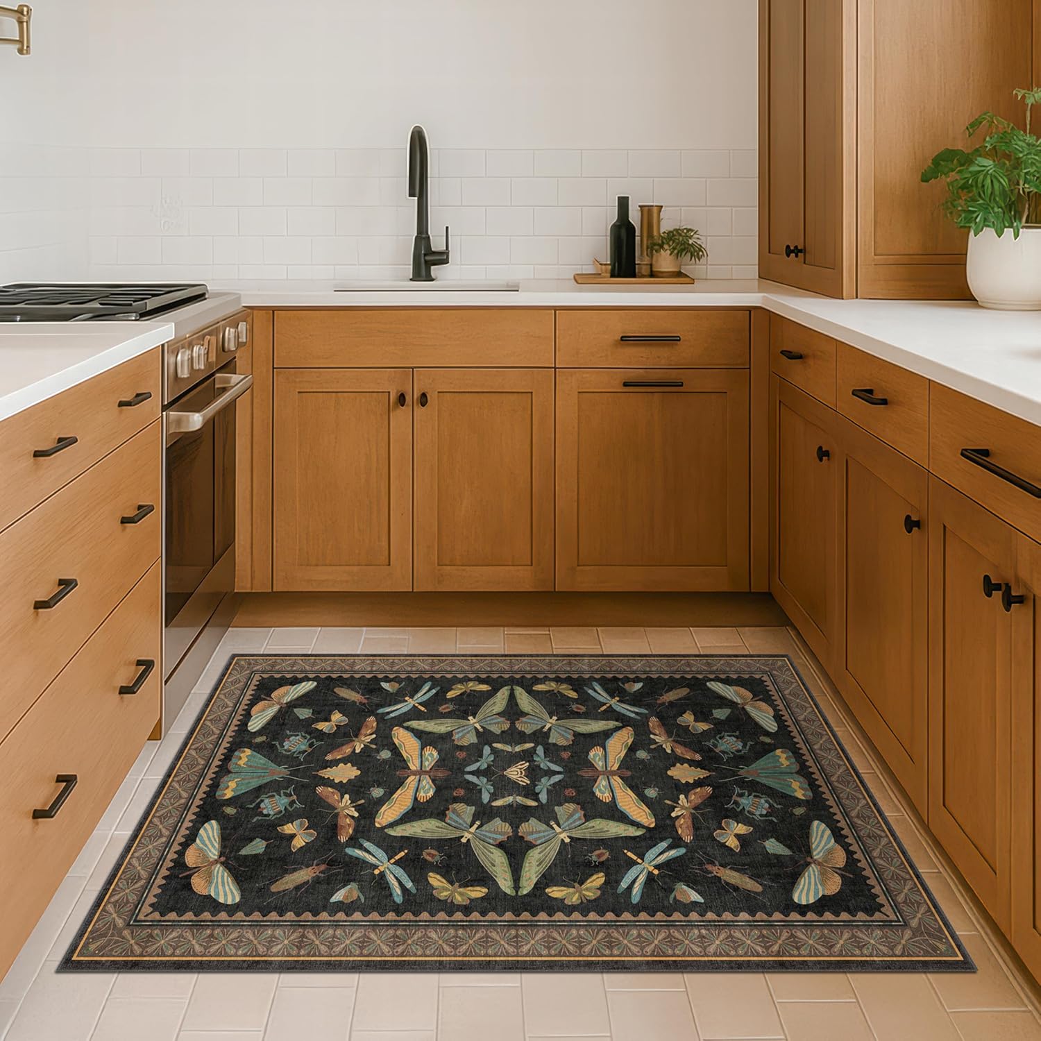 - Eclectic Vintage Charm: Make a bold statement with this insect-themed area rug, set against a black and brown background. Intricate illustrations of moths, butterflies, and dragonflies shine. Earthy tones of mustard, teal, sage green, rust, and pale blue give a warm, vintage feel. The symmetrical arrangement and scalloped interior edge bring to mind classical natural history art, while the stylized floral border adds a handcrafted touch. Ideal for antique, boho, or cottage-inspired interiors
