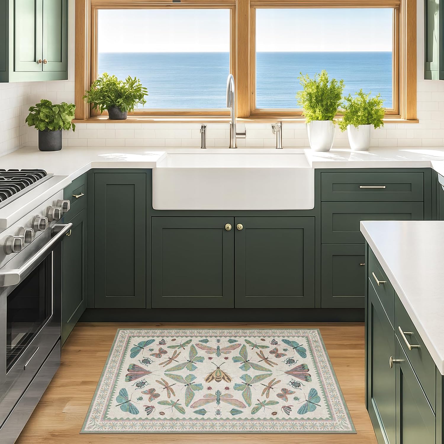 Washable Boho Bathroom Rug 2x3, Small Throw Rugs for Kitchen, Powder Room, Front Door Indoor Entrance, Non Slip Low Pile Stain Resistant, Dusty Green Colorful Cool Insect Aethestic