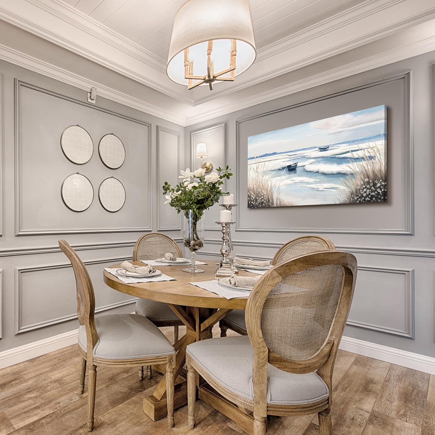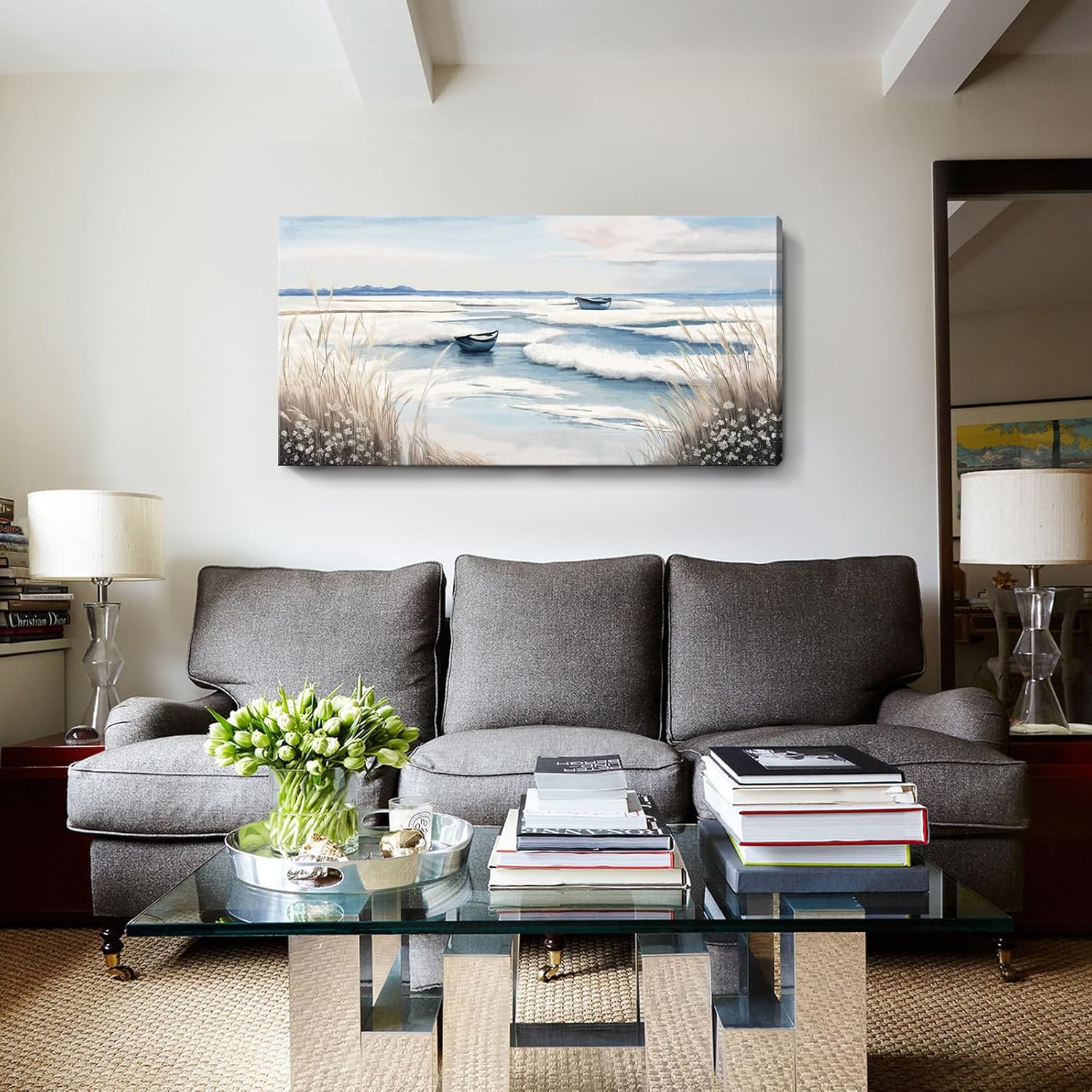 - ➤Tranquil Wall Art for Every Space. Transform your walls with this large stunning coastal canvas art featuring a serene seaside view, gentle waves, and two peaceful boats under a calming sky. Perfect for adding nature-inspired elegance to your bathroom, kitchen, bedroom, or office décor