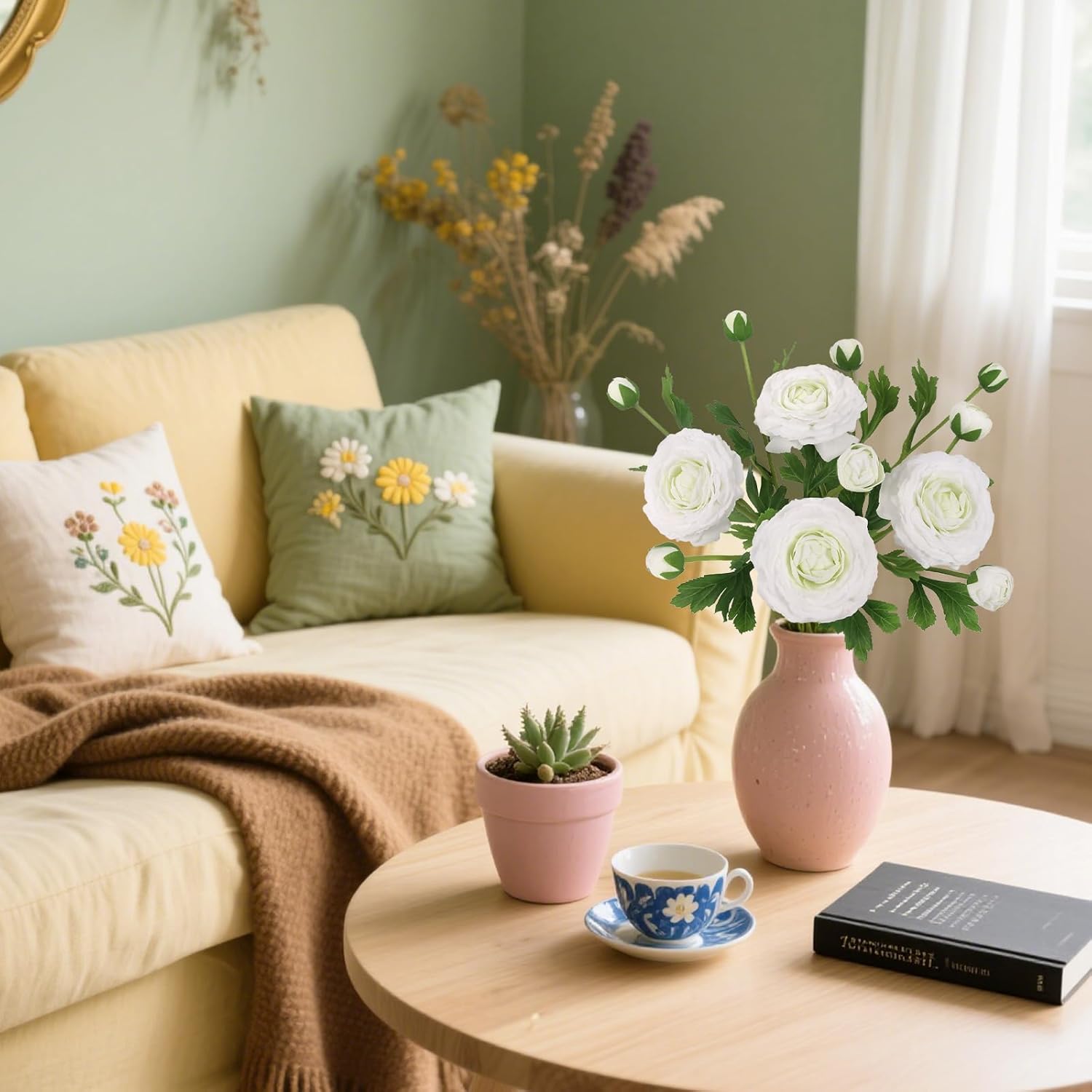 - Easy Maintenance: Faux ranunculus flowers withstands indoor humidity and sunlight without watering, wilting, or shedding.These artificial flowers stems withstand indoor heat and humidity, staying pristine throughout multi-day celebrations