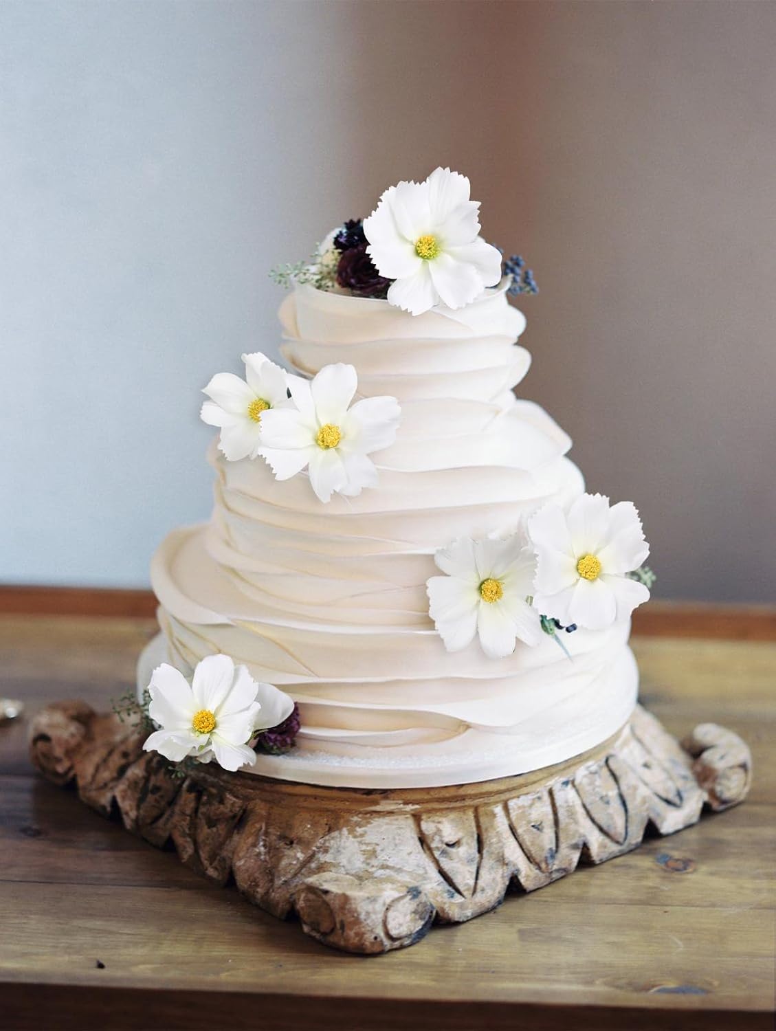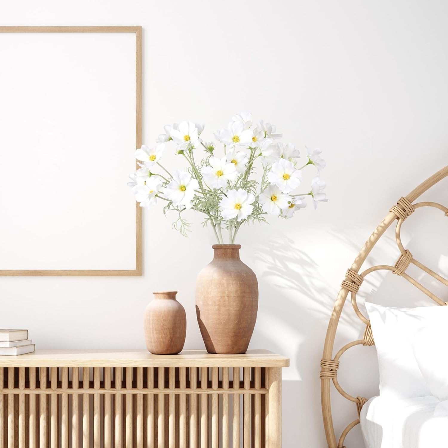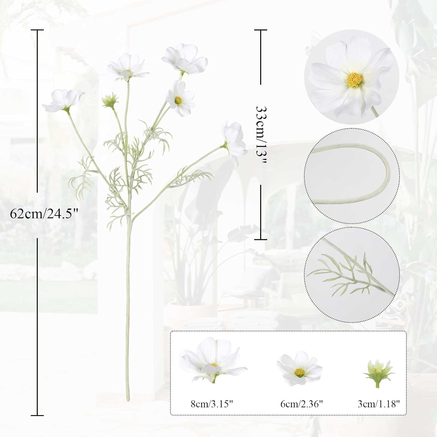 - Quantity and Size: Packed 5PCS white cosmos artificial flowers. Total approx. 24.5inches/62cm height, bigger daisy flower 3.15”/8cm, smaller 2.36'' /6cm, cosmos bud 1.18”/3cm. Each daisy flowers artificial wildflowers set with 4 large flower heads, 1 small and 1 bud, total with 30 flowers heads. The long stem artificial flowers is ideal for your tall flowers for floor vase floral arrangements