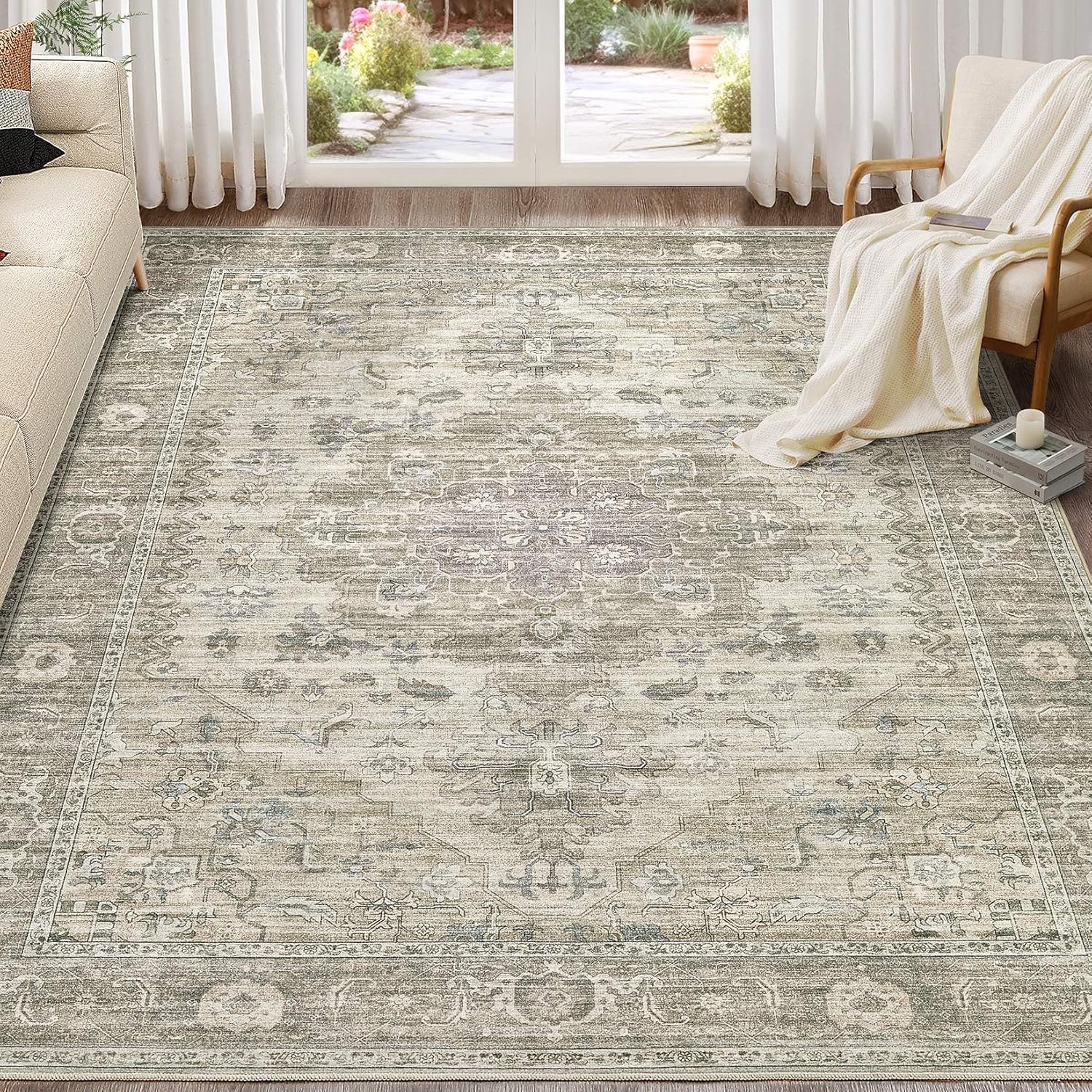 Washable Area Rugs for Living Room -10x12 Neutral Vintage Distressed Floral Farmhouse Boho Large Soft Floor Rug Indoor Non Slip Carpet for Living Room Bedroom Dining Room Office -Brown/Tan