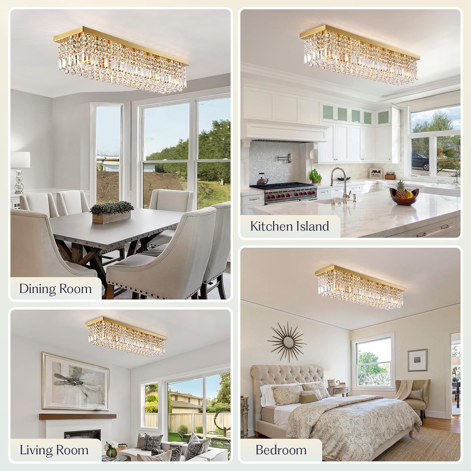- STYLISH ELEGANT CRYSTAL CHANDELIER: This luxurious gold rectangular crystal chandelier features a unique raindrop design with high-quality K9 crystals to create a glamorous light-reflecting effect that adds a touch of luxury and elegance to any space. Whether it's modern, classic or farmhouse style, this flush mount chandelier blends well